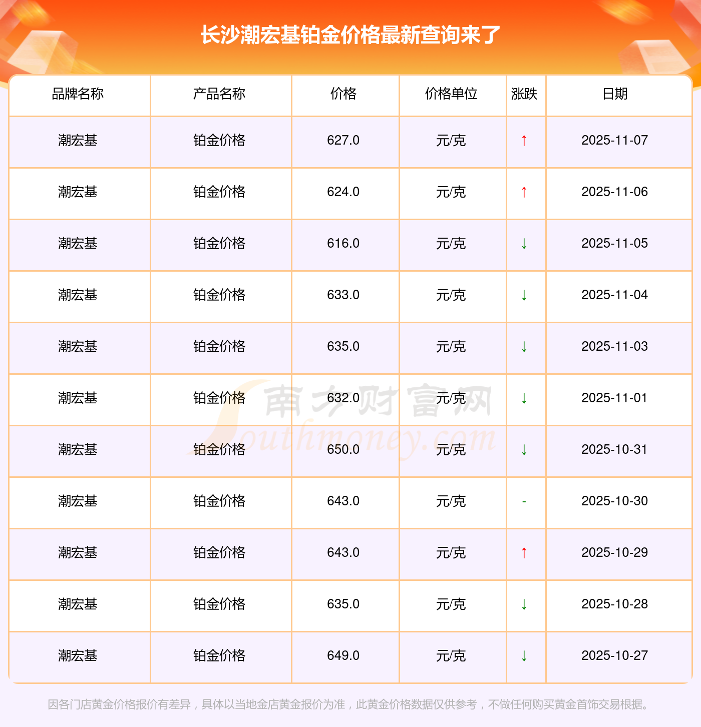 2025年11月9日,長(zhǎng)沙潮宏基鉑金價(jià)格每克的價(jià)值量定格在627.0元/克。