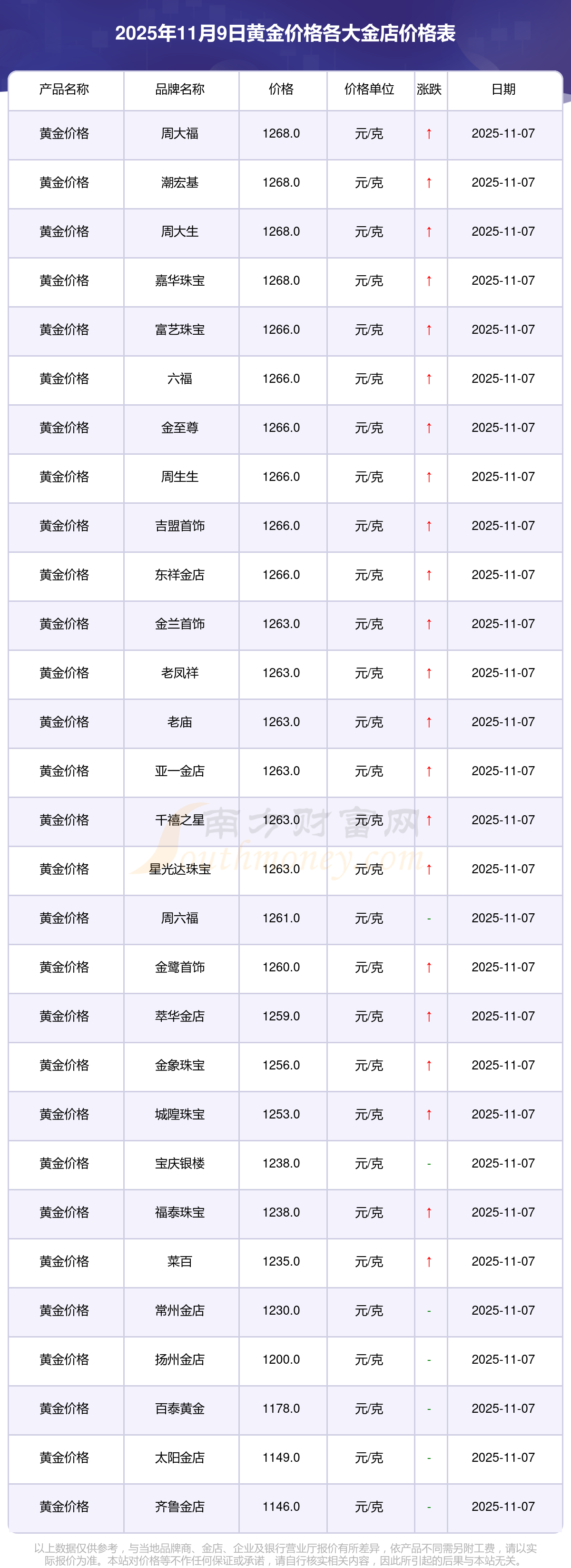 2025年11月9日,寶泉錢幣、金蘭首飾、金蘭首飾、謝瑞麟、謝瑞麟、謝瑞麟、謝瑞麟、謝瑞麟、金銀街、金銀街、金銀街等各大金店品牌黃金價(jià)格今日價(jià)格如下:寶泉錢幣11.4元/克、金蘭首飾1263.0元/克、金蘭首飾560.0元/克、謝瑞麟1202.0元/克、謝瑞麟1268.0元/克、謝瑞麟44260.0、謝瑞麟13080.0、謝瑞麟39960.0、金銀街1243.0元/克、金銀街1258.0元/克、金銀街1248.0元/克。