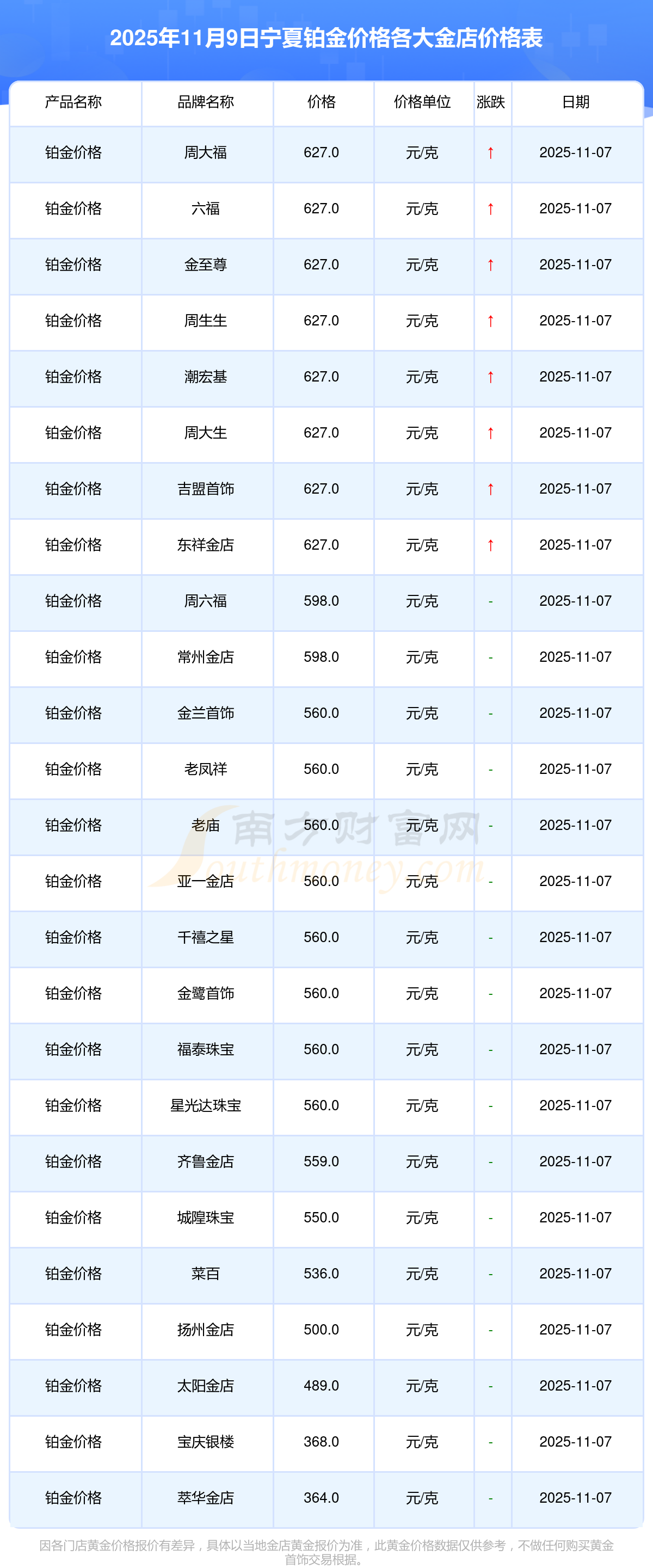 2025年11月9日寧夏寶泉錢幣、金蘭首飾、金蘭首飾、謝瑞麟、謝瑞麟、謝瑞麟、謝瑞麟、謝瑞麟、金銀街、金銀街、金銀街等各大金店品牌鉑金價格最新價格行情來了,如下:寶泉錢幣銀條價格11.4元/克,金蘭首飾黃金價格1263.0元/克,金蘭首飾鉑金價格560.0元/克,謝瑞麟金條價格(內(nèi)地)1202.0元/克,謝瑞麟金飾價格(內(nèi)地)1268.0元/克,謝瑞麟黃金飾品(香港)44260.0,謝瑞麟鉑金飾品(香港)13080.0,謝瑞麟金條金價(香港)39960.0,金銀街投資金條1243.0元/克,金銀街工藝金條1258.0元/克,金銀街千足金首飾1248.0元/克。