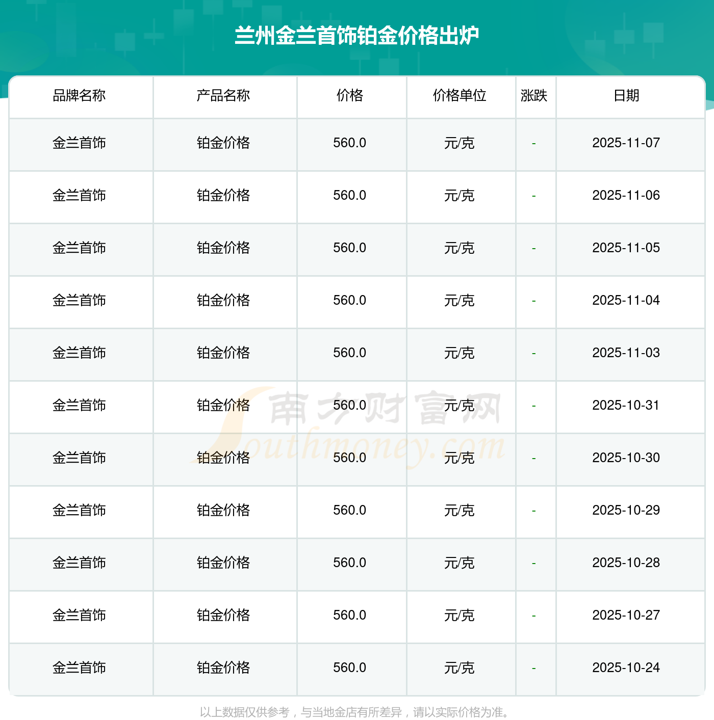 今日(2025年11月9日)蘭州金蘭首飾鉑金價(jià)格最新價(jià)格為560.0元/克。