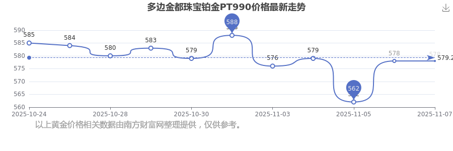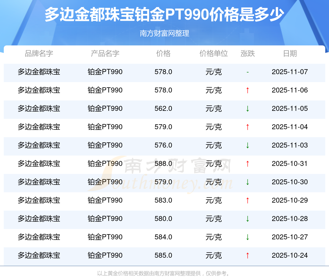 多邊金都珠寶 鉑金PT990價(jià)格在今日更新至578.0元/克。