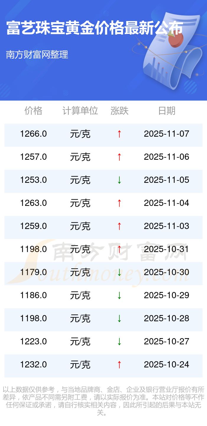 今日(2025年11月9日)富藝珠寶黃金價格:1266.0元/克。
