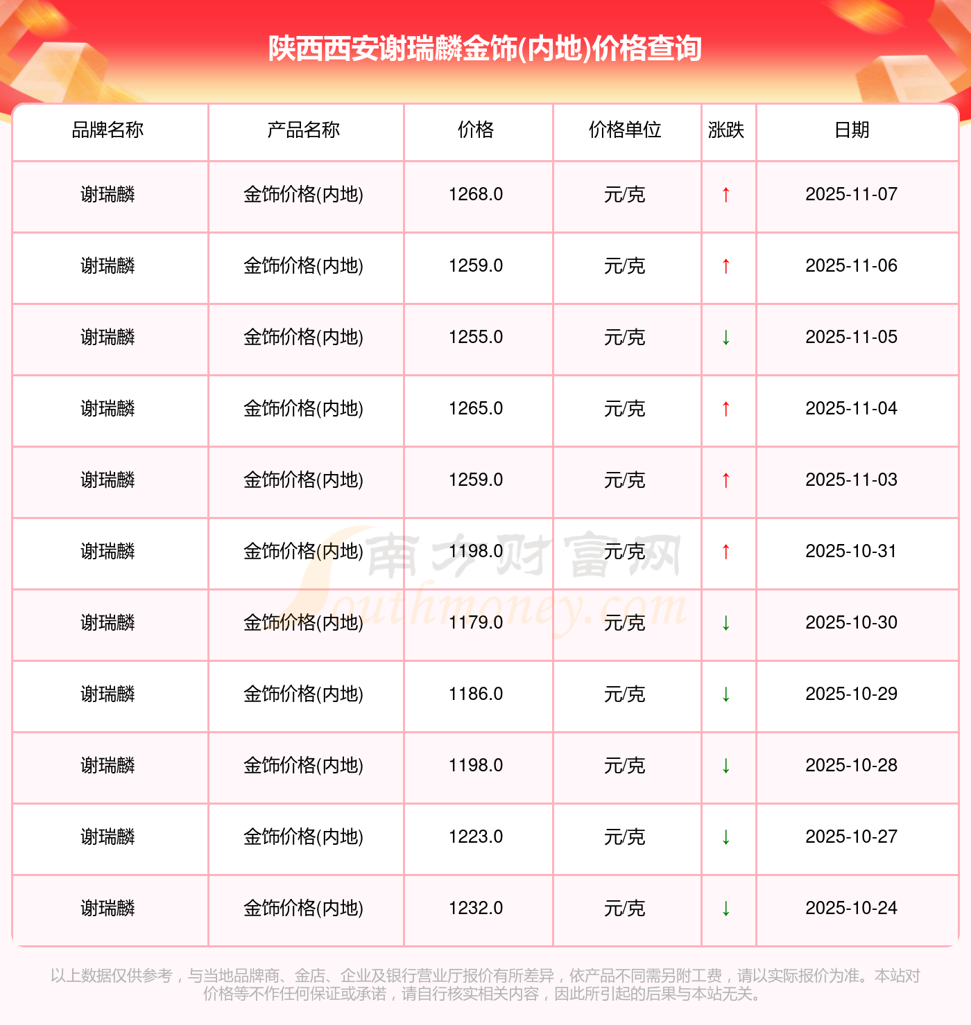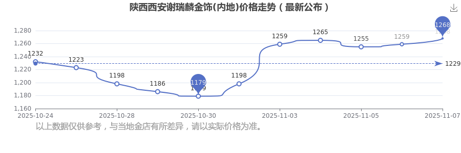 今日(2025年11月9日),陜西西安謝瑞麟金飾價(jià)格(內(nèi)地)的定價(jià)為 1268.0元/克。