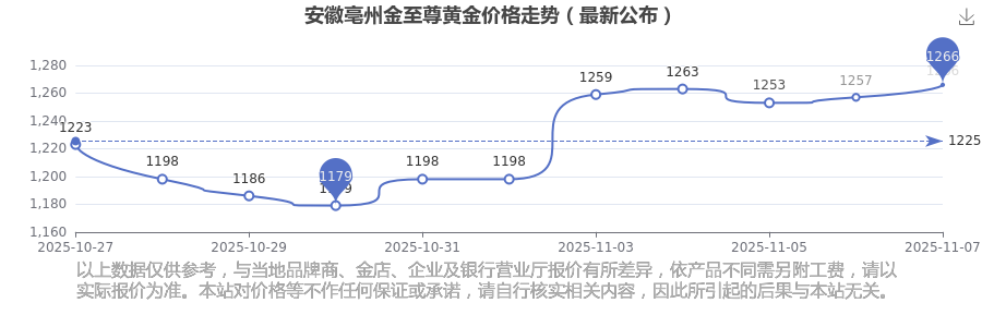 安徽亳州金至尊黃金價(jià)格在 2025年11月9日,其市場價(jià)格為 1266.0元/克。