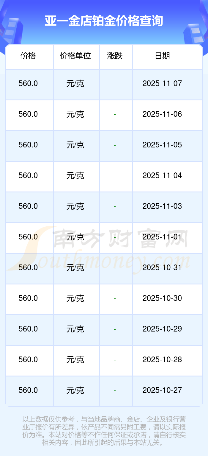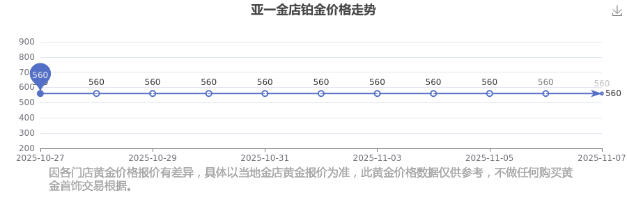 今日(2025年11月9日)亞一金店鉑金價格為560.0元/克。