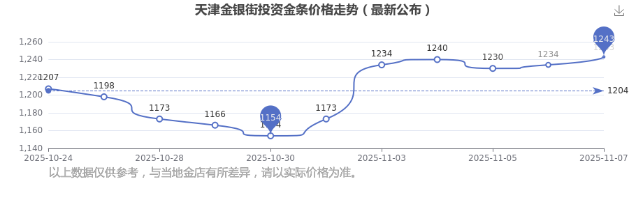 2025年11月9日這一天,天津金銀街的投資金條以 1243.0元/克的價格售賣。