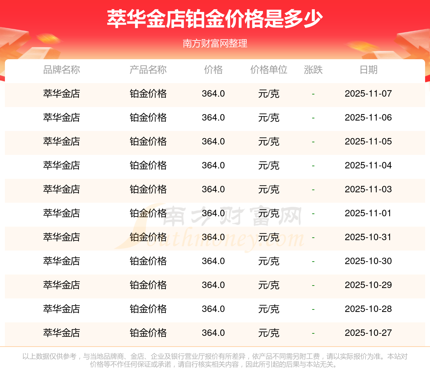 今日萃華金店鉑金價(jià)格:364.0元/克。