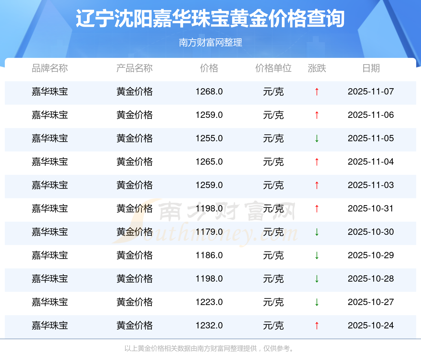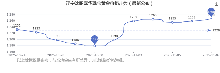 遼寧沈陽(yáng)嘉華珠寶在 2025年11月9日,黃金價(jià)格的售賣價(jià)格是 1268.0元/克。