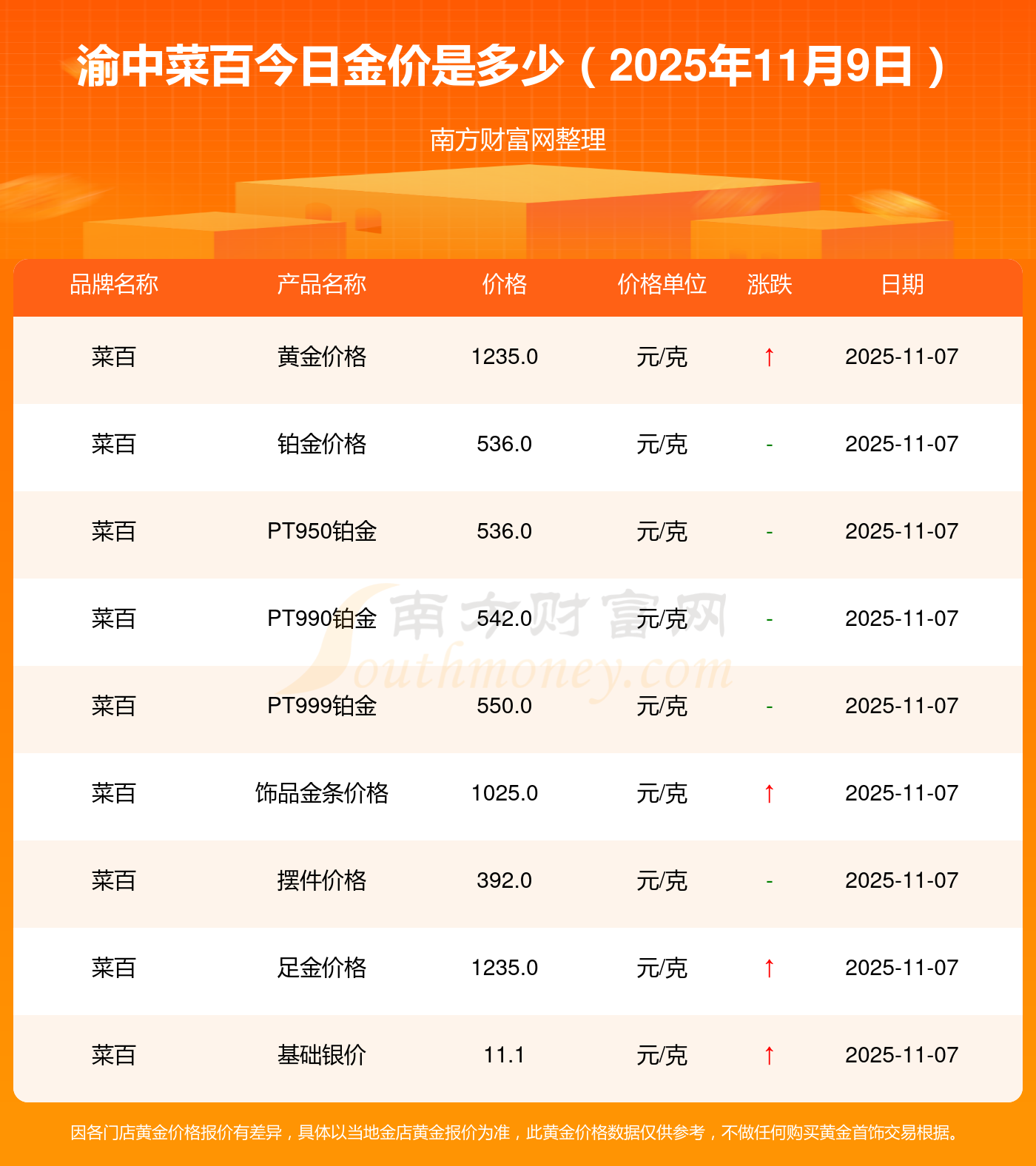 今日黃金售價(jià)多少?現(xiàn)在黃金一克值多少錢(qián)呢?2025年11月9日渝中菜百一克黃金的售價(jià)是多少:銀條價(jià)格11.4元/克,黃金價(jià)格1263.0元/克,鉑金價(jià)格560.0元/克,金條價(jià)格(內(nèi)地)1202.0元/克,金飾價(jià)格(內(nèi)地)1268.0元/克,黃金飾品(香港)44260.0,鉑金飾品(香港)13080.0,金條金價(jià)(香港)39960.0,投資金條1243.0元/克,工藝金條1258.0元/克,千足金首飾1248.0元/克。