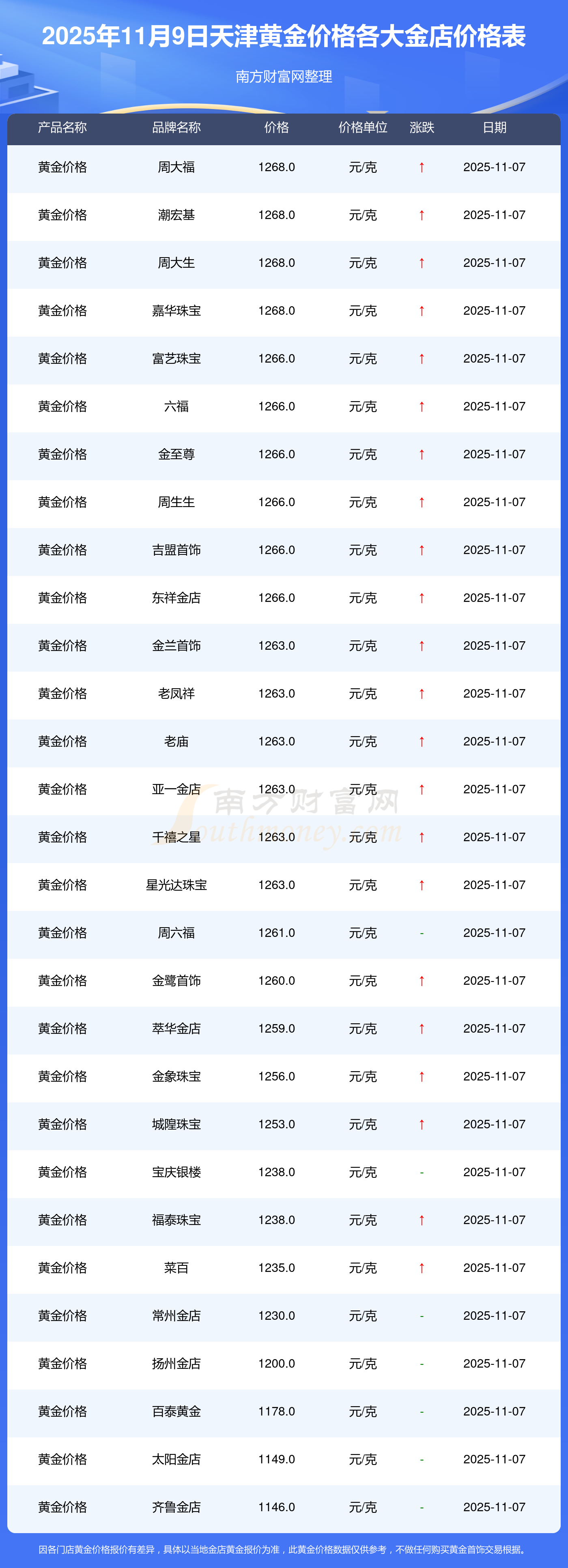 今天是2025年11月9日,天津?qū)毴X幣、金蘭首飾、金蘭首飾、謝瑞麟、謝瑞麟、謝瑞麟、謝瑞麟、謝瑞麟、金銀街、金銀街、金銀街等各大金店品牌黃金價格最新價格如下:寶泉錢幣11.4元/克、金蘭首飾1263.0元/克、金蘭首飾560.0元/克、謝瑞麟1202.0元/克、謝瑞麟1268.0元/克、謝瑞麟44260.0、謝瑞麟13080.0、謝瑞麟39960.0、金銀街1243.0元/克、金銀街1258.0元/克、金銀街1248.0元/克。