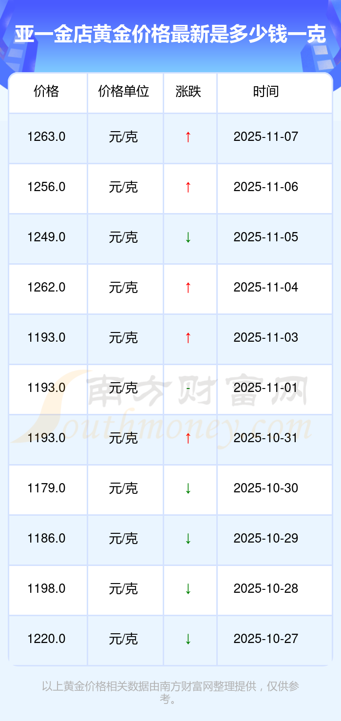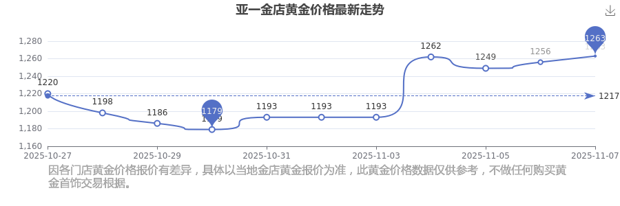 2025年11月9日亞一金店黃金價(jià)格是1263.0元/克。