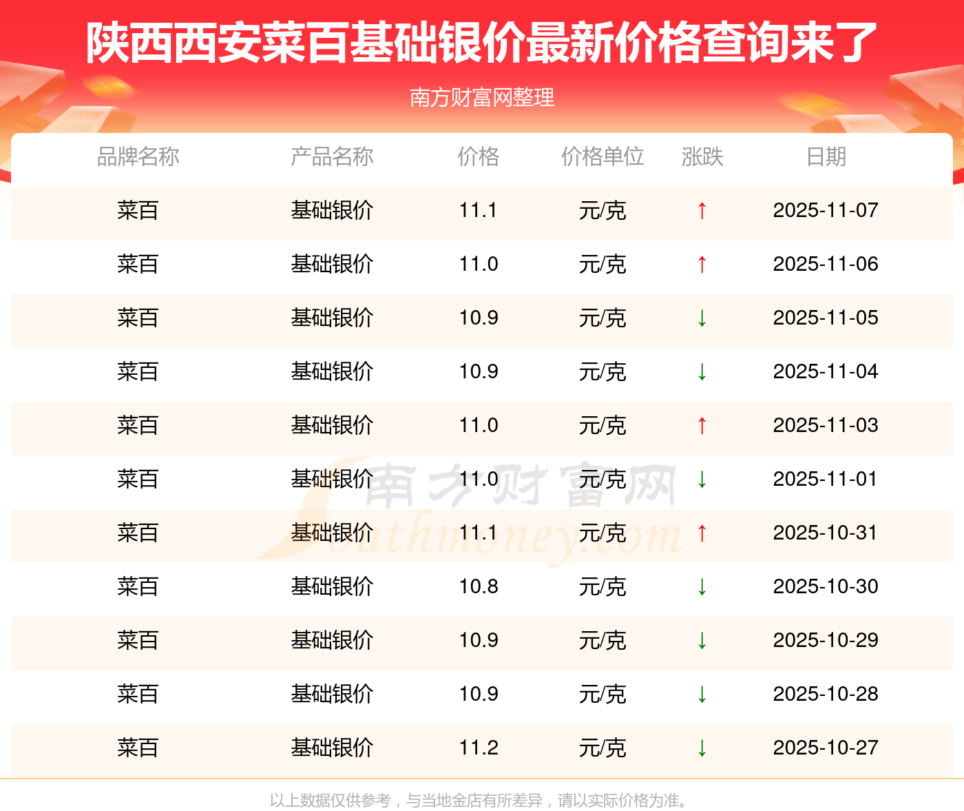 2025年11月9日,陜西西安菜百所售基礎(chǔ)銀價,其價格設(shè)定為 11.1元/克。