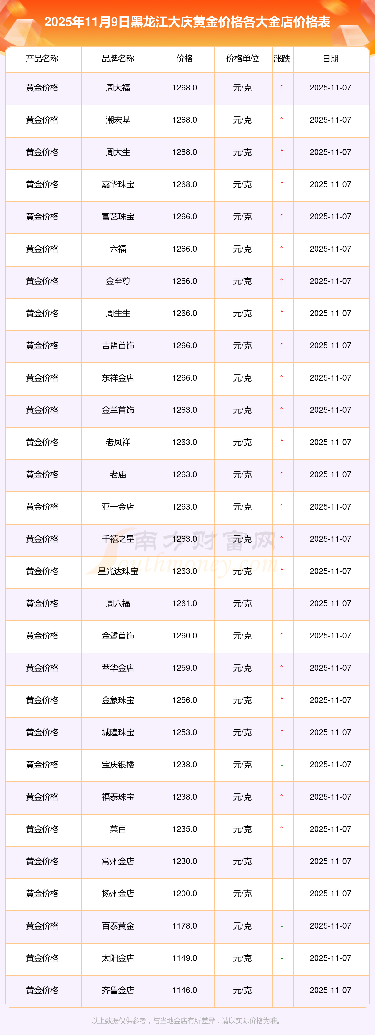 今天是2025年11月9日,黑龍江大慶寶泉錢幣、金蘭首飾、金蘭首飾、謝瑞麟、謝瑞麟、謝瑞麟、謝瑞麟、謝瑞麟、金銀街、金銀街、金銀街等各大金店品牌黃金價(jià)格最新價(jià)格如下:寶泉錢幣11.4元/克、金蘭首飾1263.0元/克、金蘭首飾560.0元/克、謝瑞麟1202.0元/克、謝瑞麟1268.0元/克、謝瑞麟44260.0、謝瑞麟13080.0、謝瑞麟39960.0、金銀街1243.0元/克、金銀街1258.0元/克、金銀街1248.0元/克。