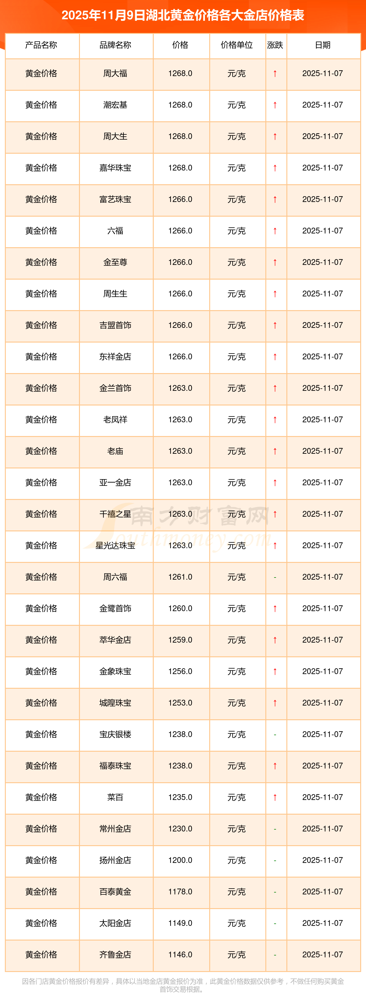2025年11月9日湖北各大金店黃金價格最新價格:寶泉錢幣11.4元/克,金蘭首飾1263.0元/克,金蘭首飾560.0元/克,謝瑞麟1202.0元/克,謝瑞麟1268.0元/克,謝瑞麟44260.0,謝瑞麟13080.0,謝瑞麟39960.0,金銀街1243.0元/克,金銀街1258.0元/克,金銀街1248.0元/克。