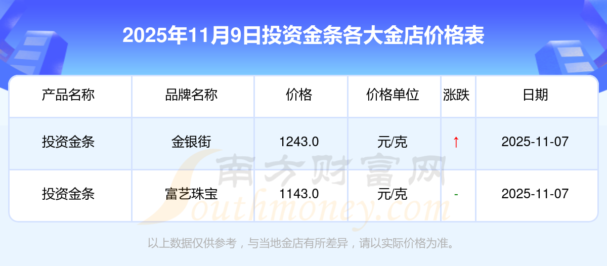 投資金條最高的金店是金銀街,報價1243.0元/克,最低的是富藝珠寶,報價1143.0元/克。今日投資金條高低差為100元/克。