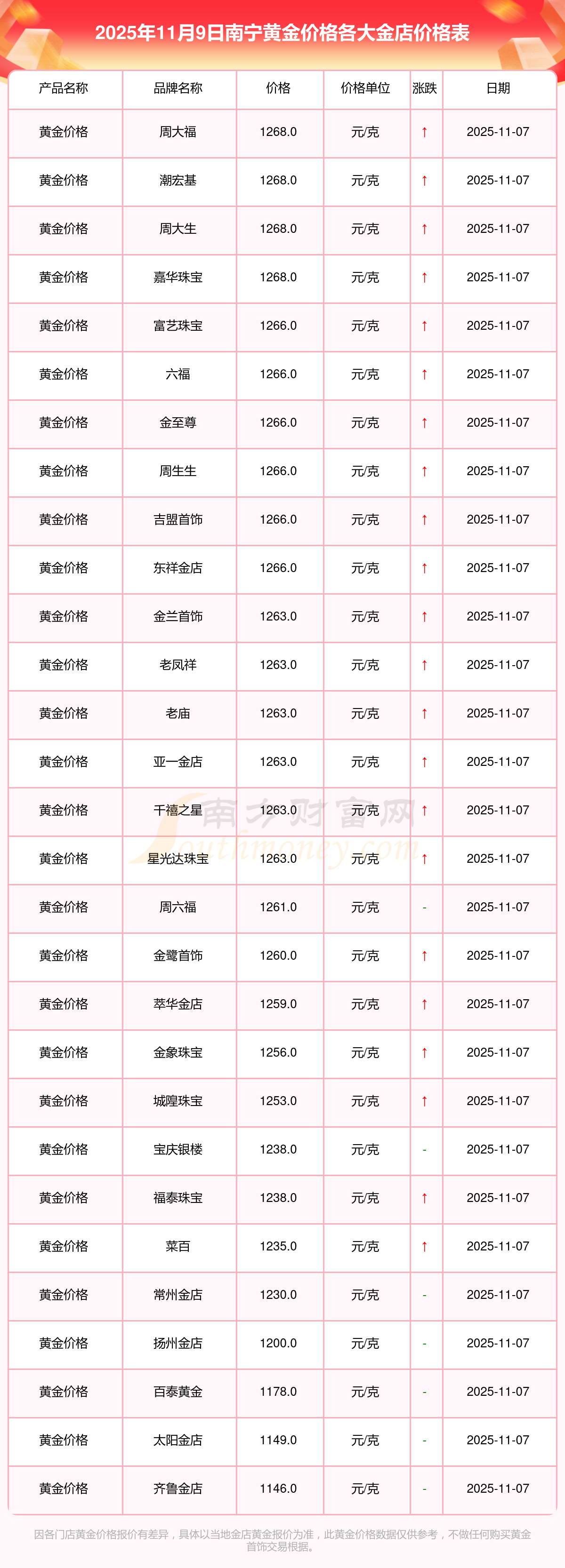 2025年11月9日,南寧寶泉錢幣、金蘭首飾、金蘭首飾、謝瑞麟、謝瑞麟、謝瑞麟、謝瑞麟、謝瑞麟、金銀街、金銀街、金銀街等各大金店品牌黃金價格今日價格如下:寶泉錢幣11.4元/克、金蘭首飾1263.0元/克、金蘭首飾560.0元/克、謝瑞麟1202.0元/克、謝瑞麟1268.0元/克、謝瑞麟44260.0、謝瑞麟13080.0、謝瑞麟39960.0、金銀街1243.0元/克、金銀街1258.0元/克、金銀街1248.0元/克。