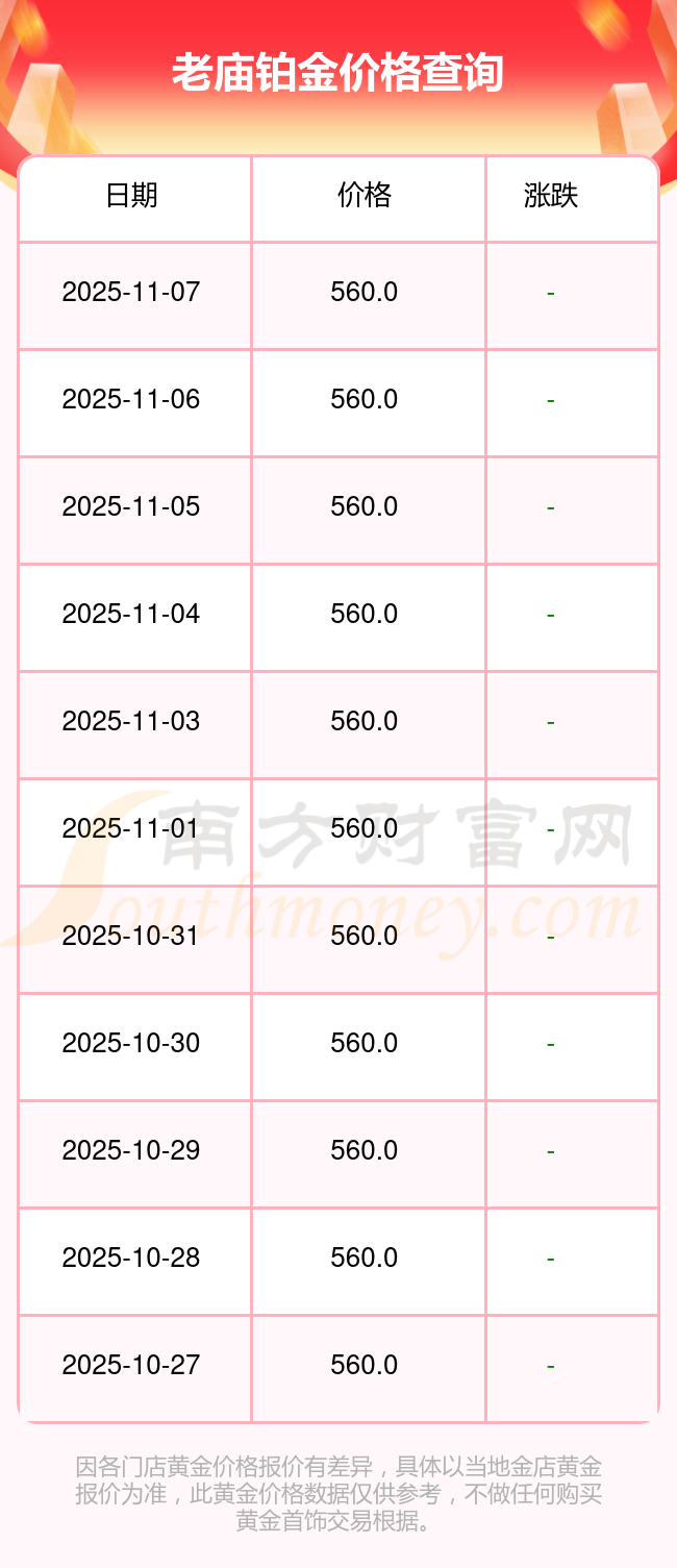 今日老廟所公布的 鉑金價格最新價格為560.0元/克。