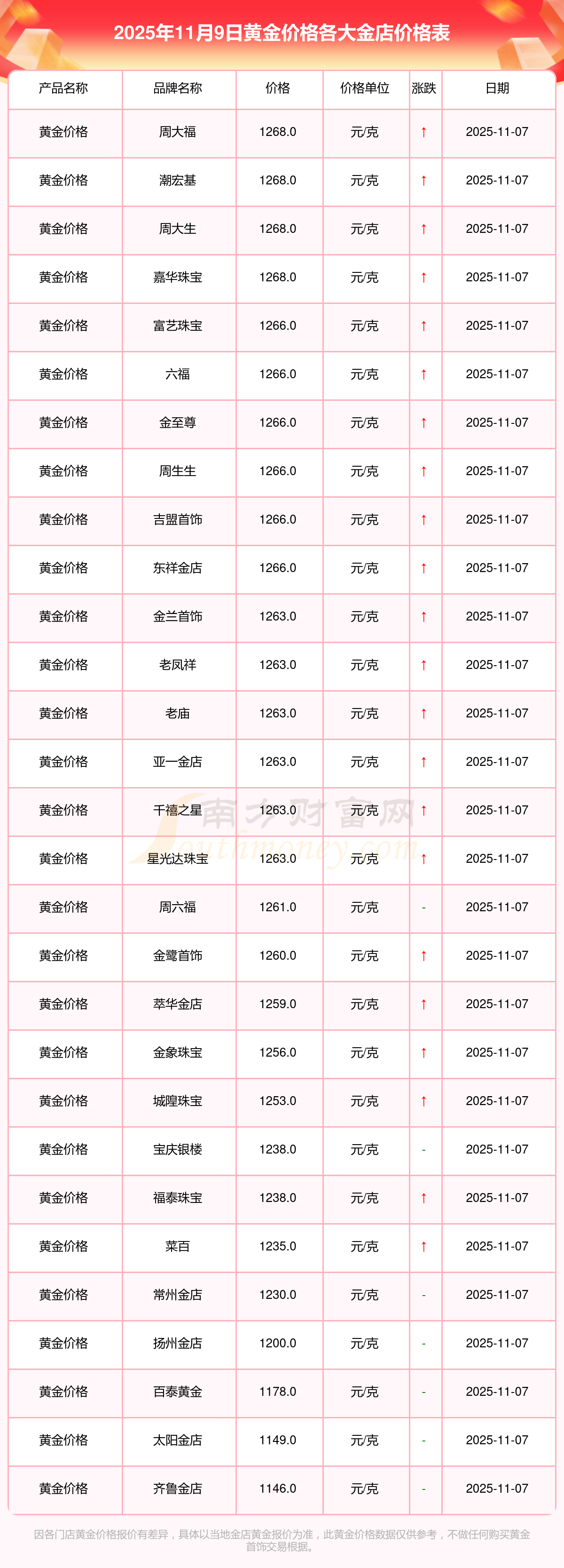 2025年11月9日,寶泉錢幣、金蘭首飾、金蘭首飾、謝瑞麟、謝瑞麟、謝瑞麟、謝瑞麟、謝瑞麟、金銀街、金銀街、金銀街等各大金店品牌黃金價(jià)格今日價(jià)格如下:寶泉錢幣11.4元/克、金蘭首飾1263.0元/克、金蘭首飾560.0元/克、謝瑞麟1202.0元/克、謝瑞麟1268.0元/克、謝瑞麟44260.0、謝瑞麟13080.0、謝瑞麟39960.0、金銀街1243.0元/克、金銀街1258.0元/克、金銀街1248.0元/克。