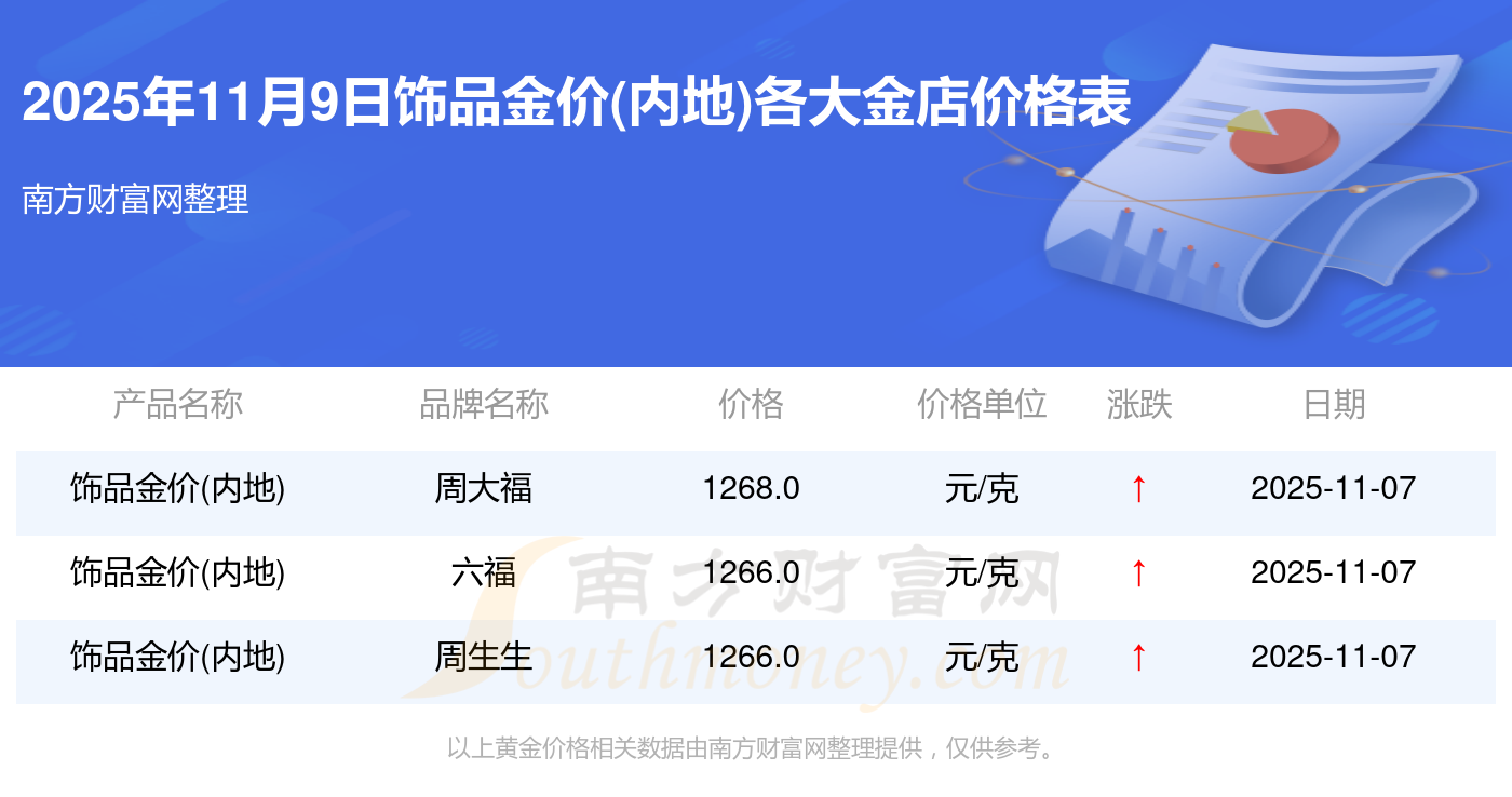 2025年11月9日各大金店飾品金價(jià)(內(nèi)地)一克多少錢?各大金店飾品金價(jià)(內(nèi)地)最新來了,每家金店的黃金價(jià)格之所以不一樣,黃金基礎(chǔ)價(jià)格是由國際黃金市場的供求關(guān)系和價(jià)格波動所定的。金店會根據(jù)國際金價(jià)的變化來制定和調(diào)整金飾的價(jià)格。接下來隨小編來看看今日市場行情。