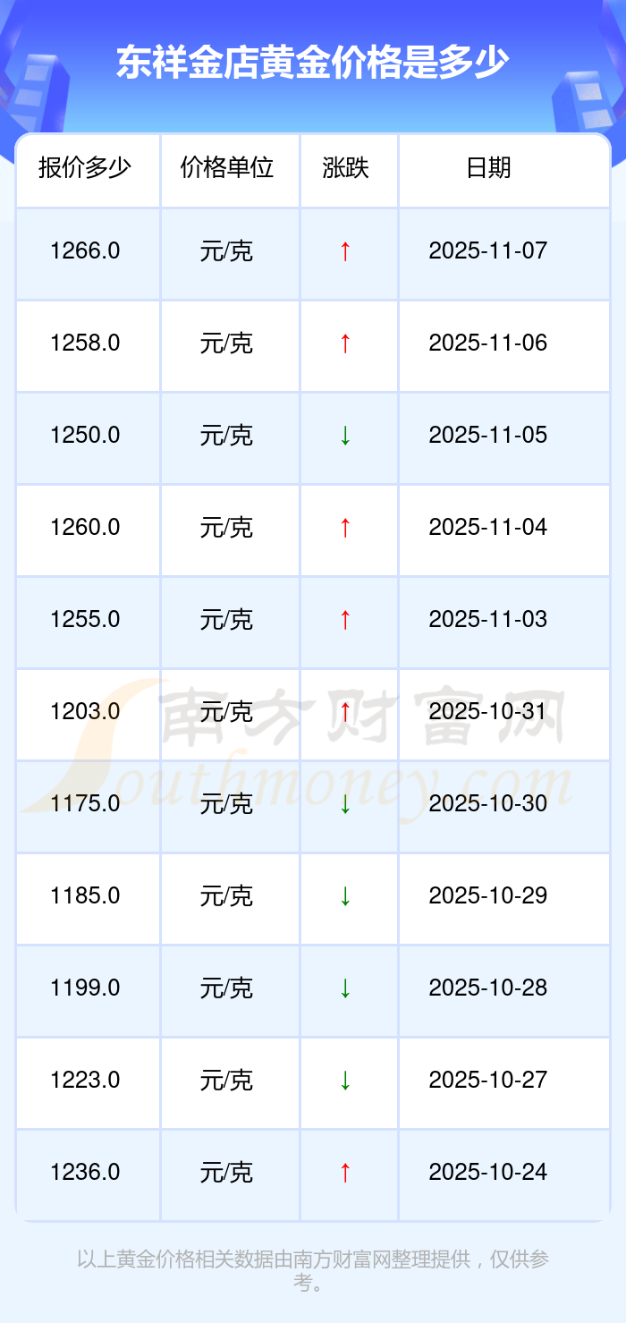 今日(2025年11月9日)東祥金店黃金價(jià)格的價(jià)格為1266.0元/克。