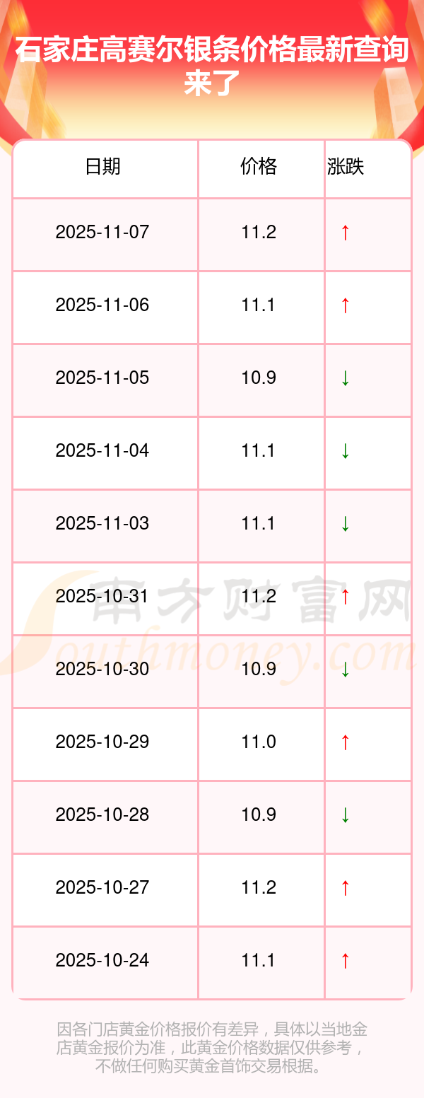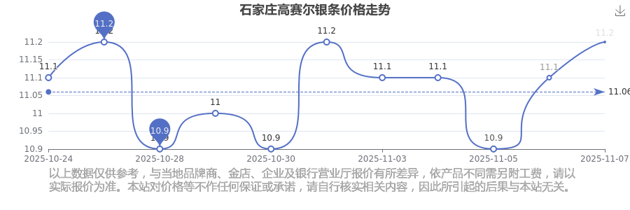 今日2025年11月9日,石家莊高賽爾銀條價(jià)格為11.2元/克。