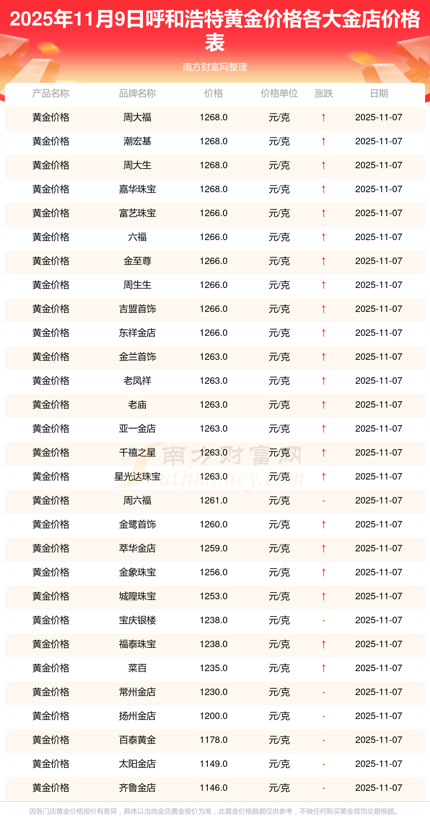 2025年11月9日呼和浩特各大金店黃金價(jià)格最新價(jià)格查詢來了:寶泉錢幣11.4元/克,金蘭首飾1263.0元/克,金蘭首飾560.0元/克,謝瑞麟1202.0元/克,謝瑞麟1268.0元/克,謝瑞麟44260.0,謝瑞麟13080.0,謝瑞麟39960.0,金銀街1243.0元/克,金銀街1258.0元/克,金銀街1248.0元/克。