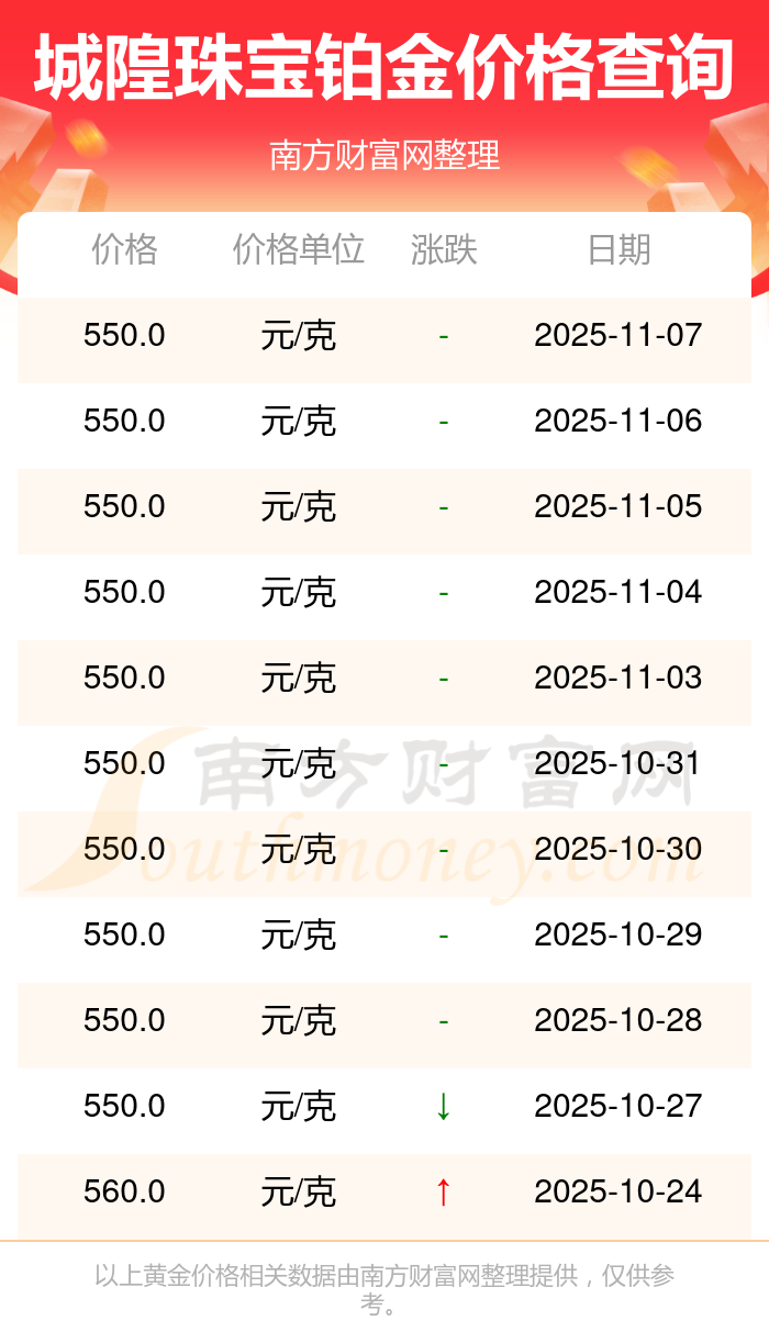今日(2025年11月9日),城隍珠寶鉑金價格最新價格為550.0元/克。