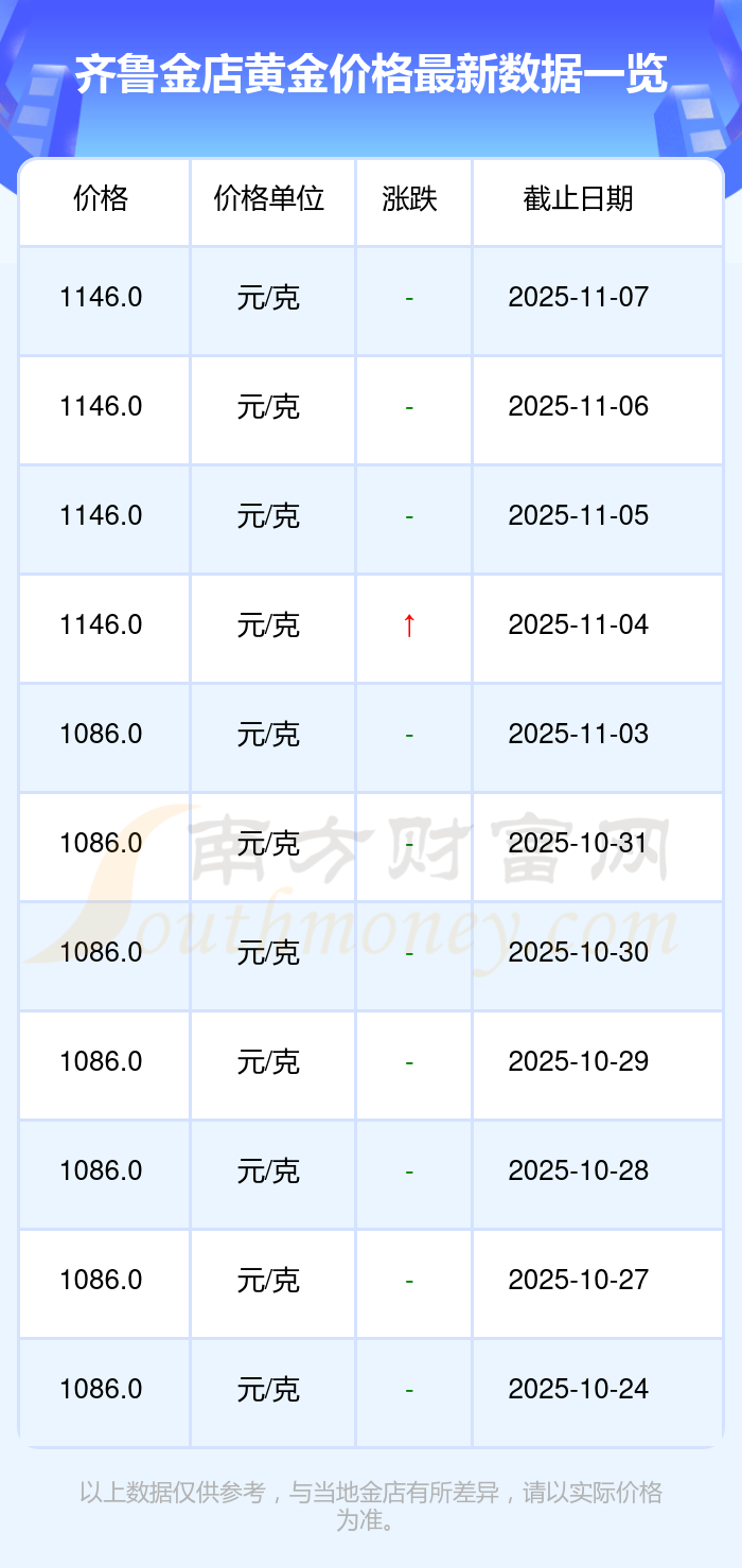 今日黃金價(jià)格查詢_現(xiàn)在金價(jià)黃金一克多少錢,黃金價(jià)格是多少錢一克?黃金每克的價(jià)錢通常來說是多少左右?當(dāng)下,齊魯金店 黃金價(jià)格今日的最新價(jià)格是1146.0元/克。