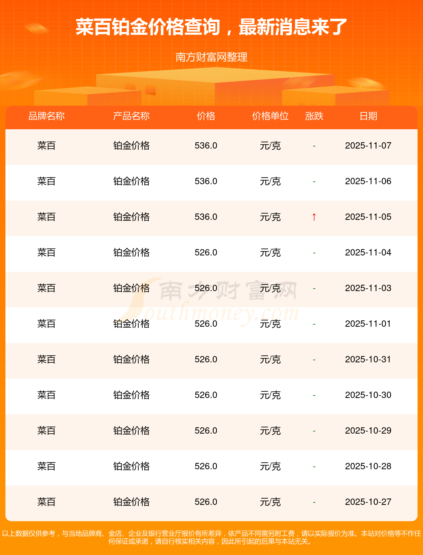今日(2025年11月9日),菜百鉑金價(jià)格:536.0元/克。