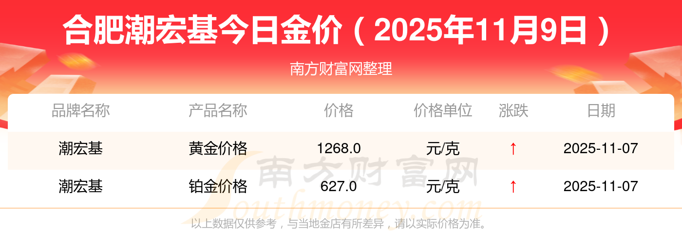 2025年11月9日合肥潮宏基一克黃金對應的價格是多少?銀條價格11.4元/克,黃金價格1263.0元/克,鉑金價格560.0元/克,金條價格(內地)1202.0元/克,金飾價格(內地)1268.0元/克,黃金飾品(香港)44260.0,鉑金飾品(香港)13080.0,金條金價(香港)39960.0,投資金條1243.0元/克,工藝金條1258.0元/克,千足金首飾1248.0元/克。