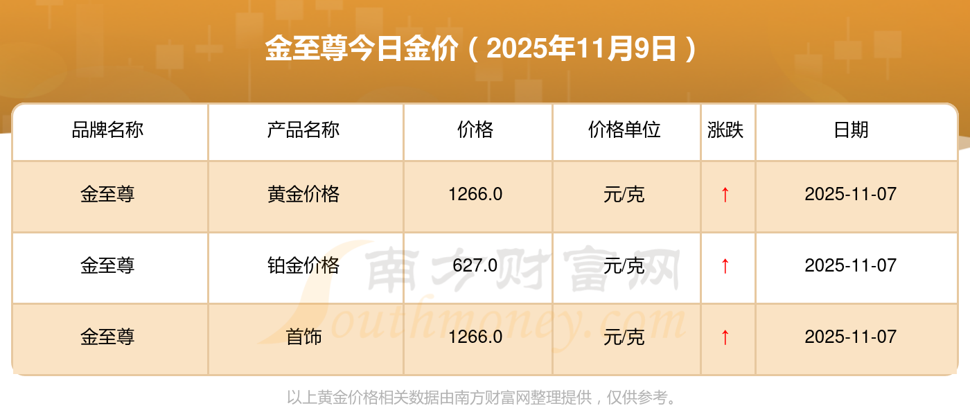 2025年11月9日金至尊最新價格:銀條價格11.4元/克,黃金價格1263.0元/克,鉑金價格560.0元/克,金條價格(內(nèi)地)1202.0元/克,金飾價格(內(nèi)地)1268.0元/克,黃金飾品(香港)44260.0,鉑金飾品(香港)13080.0,金條金價(香港)39960.0,投資金條1243.0元/克,工藝金條1258.0元/克,千足金首飾1248.0元/克。