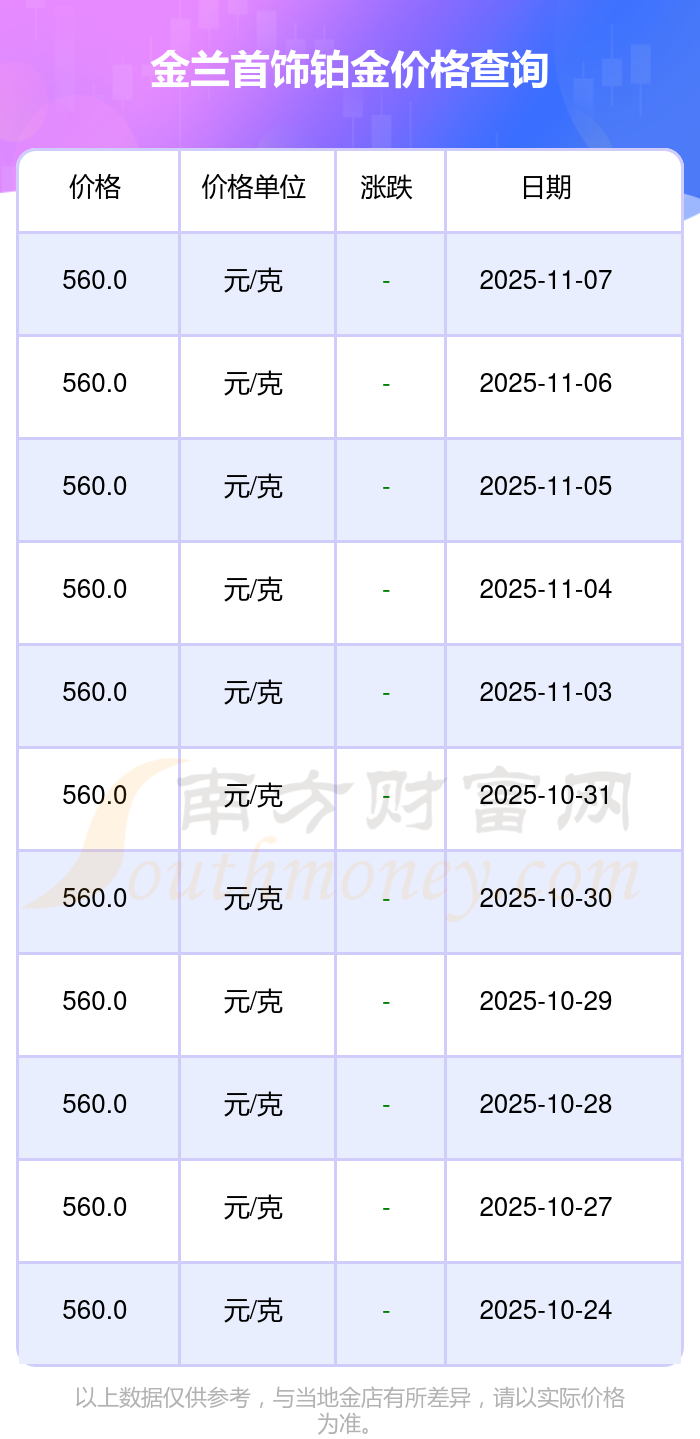 2025年11月9日金蘭首飾鉑金價格是560.0元/克。