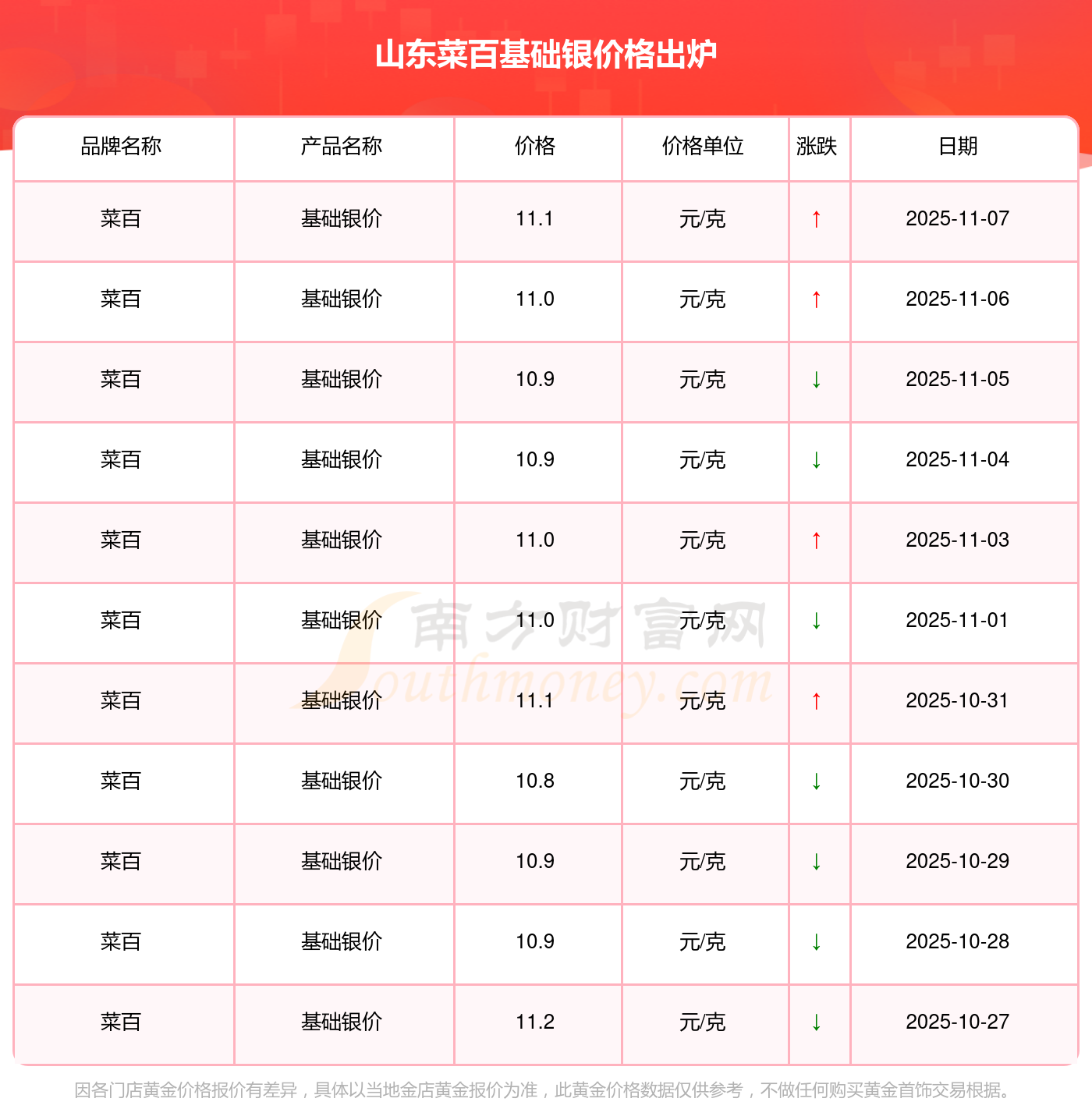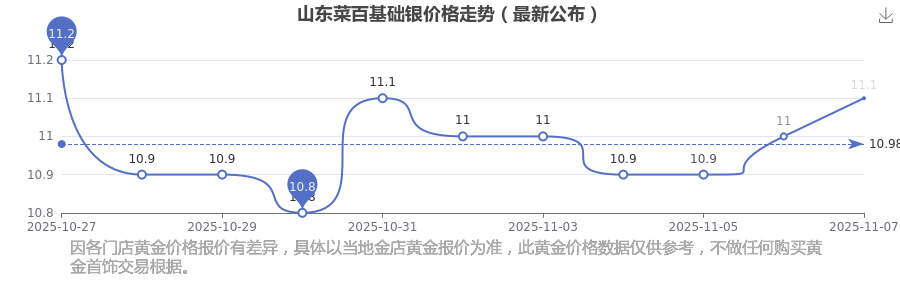 山東菜百基礎(chǔ)銀價在 2025年11月9日,其市場價格為 11.1元/克。
