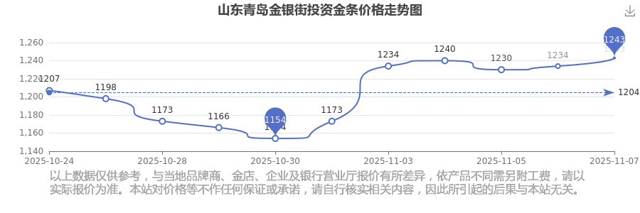2025年11月9日山東青島金銀街投資金條價格為1243.0元/克。