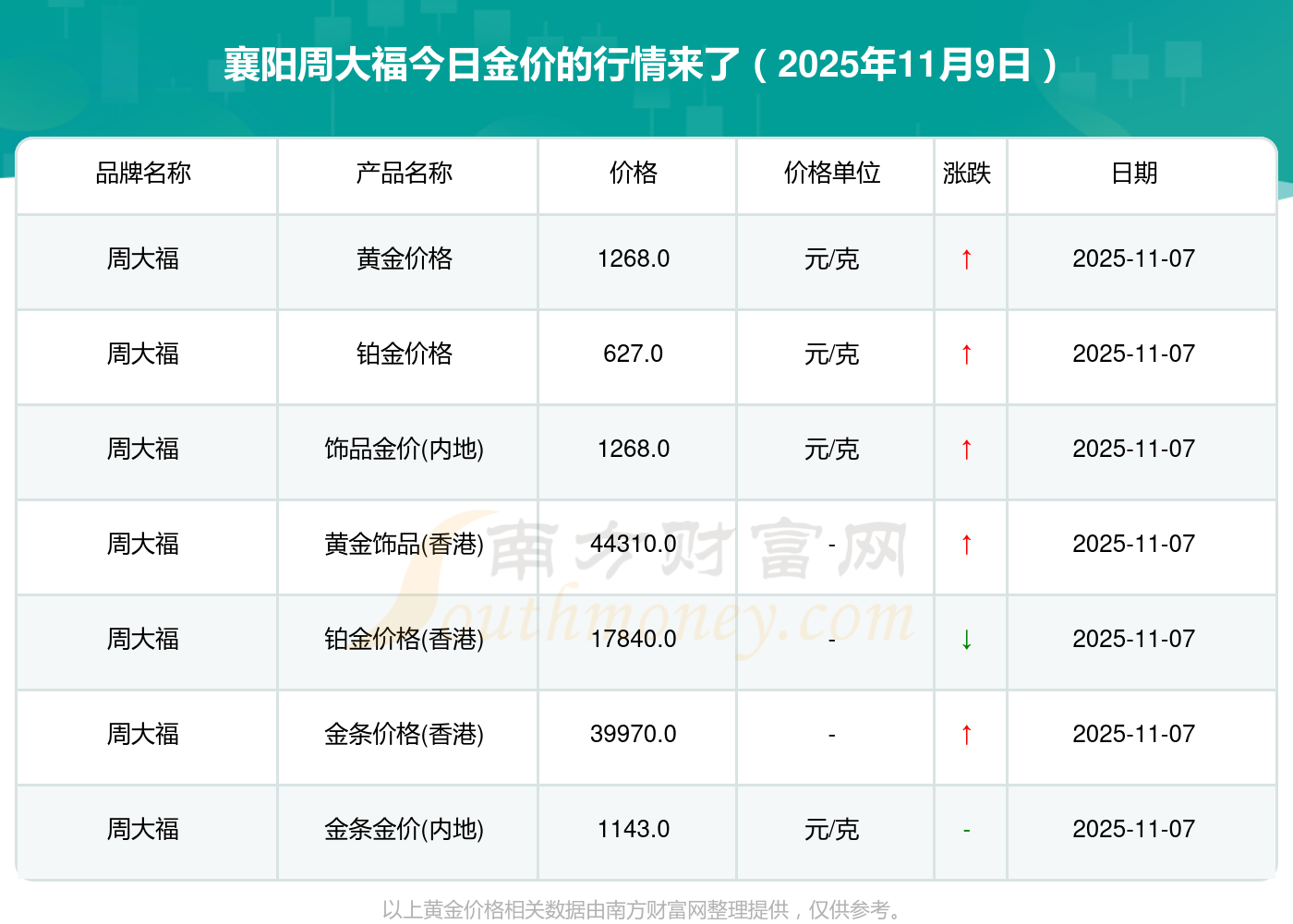 2025年11月9日襄陽(yáng)周大福一克黃金對(duì)應(yīng)的價(jià)格是多少?銀條價(jià)格11.4元/克,黃金價(jià)格1263.0元/克,鉑金價(jià)格560.0元/克,金條價(jià)格(內(nèi)地)1202.0元/克,金飾價(jià)格(內(nèi)地)1268.0元/克,黃金飾品(香港)44260.0,鉑金飾品(香港)13080.0,金條金價(jià)(香港)39960.0,投資金條1243.0元/克,工藝金條1258.0元/克,千足金首飾1248.0元/克。