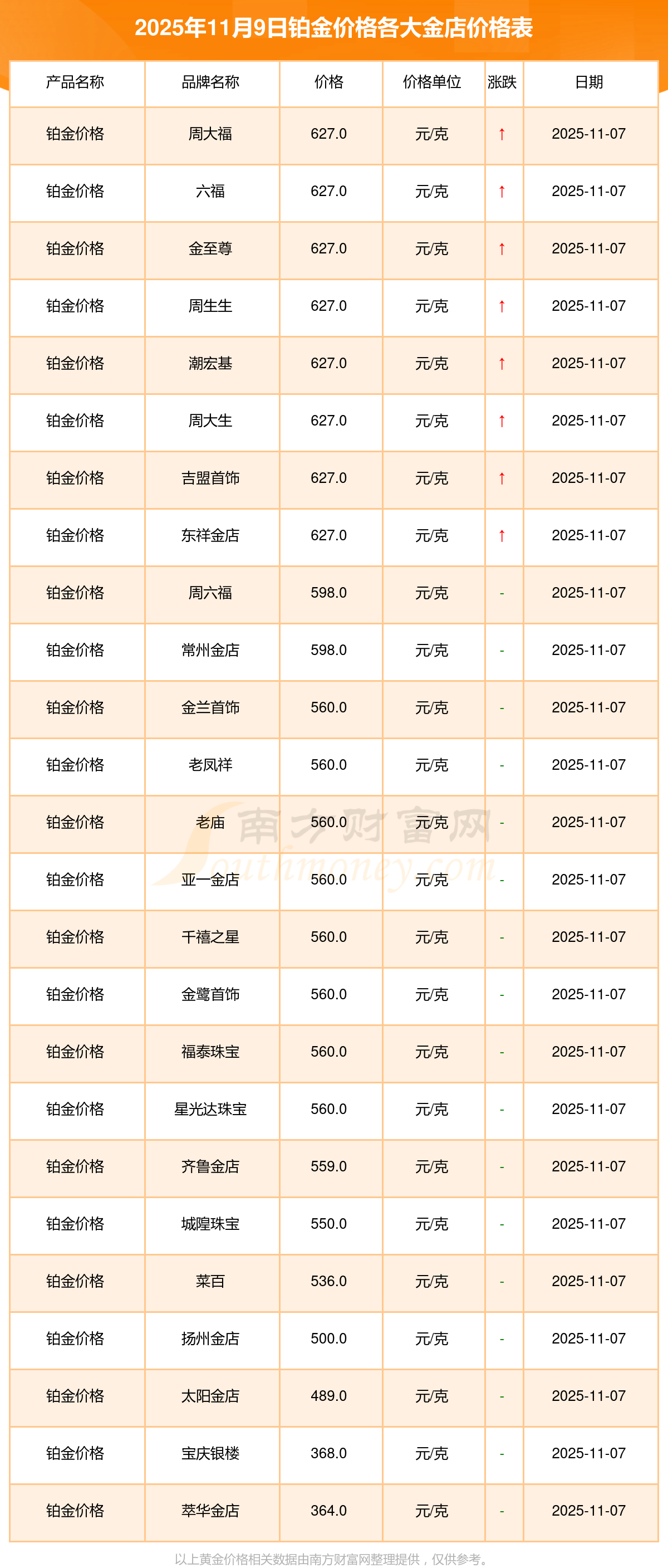 今天是2025年11月9日,寶泉錢幣、金蘭首飾、金蘭首飾、謝瑞麟、謝瑞麟、謝瑞麟、謝瑞麟、謝瑞麟、金銀街、金銀街、金銀街等各大金店品牌鉑金價格最新價格如下:寶泉錢幣11.4元/克、金蘭首飾1263.0元/克、金蘭首飾560.0元/克、謝瑞麟1202.0元/克、謝瑞麟1268.0元/克、謝瑞麟44260.0、謝瑞麟13080.0、謝瑞麟39960.0、金銀街1243.0元/克、金銀街1258.0元/克、金銀街1248.0元/克。