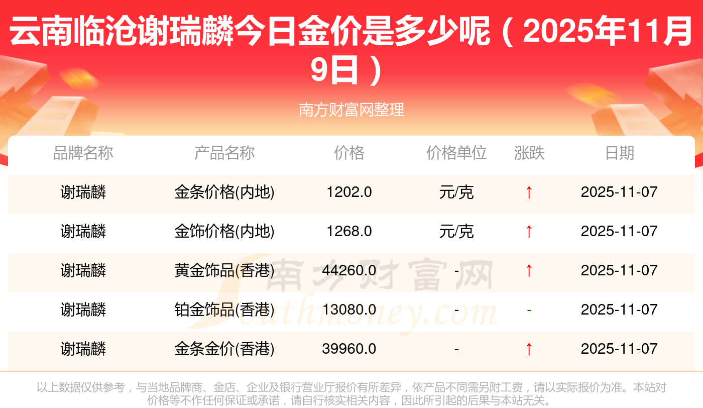 2025年11月9日黃金多少錢一克_今日云南臨滄謝瑞麟金價表一覽