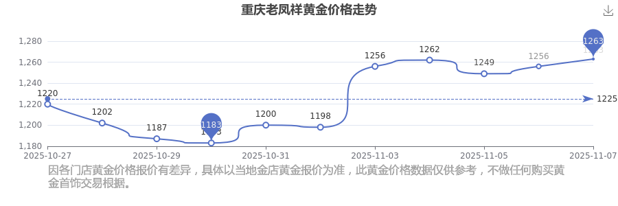 今日(2025年11月9日)重慶老鳳祥黃金價(jià)格:1263.0元/克。