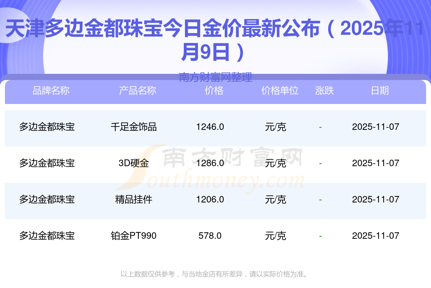 2025年11月9日天津多邊金都珠寶金價查詢:銀條價格11.4元/克,黃金價格1263.0元/克,鉑金價格560.0元/克,金條價格(內(nèi)地)1202.0元/克,金飾價格(內(nèi)地)1268.0元/克,黃金飾品(香港)44260.0,鉑金飾品(香港)13080.0,金條金價(香港)39960.0,投資金條1243.0元/克,工藝金條1258.0元/克,千足金首飾1248.0元/克。