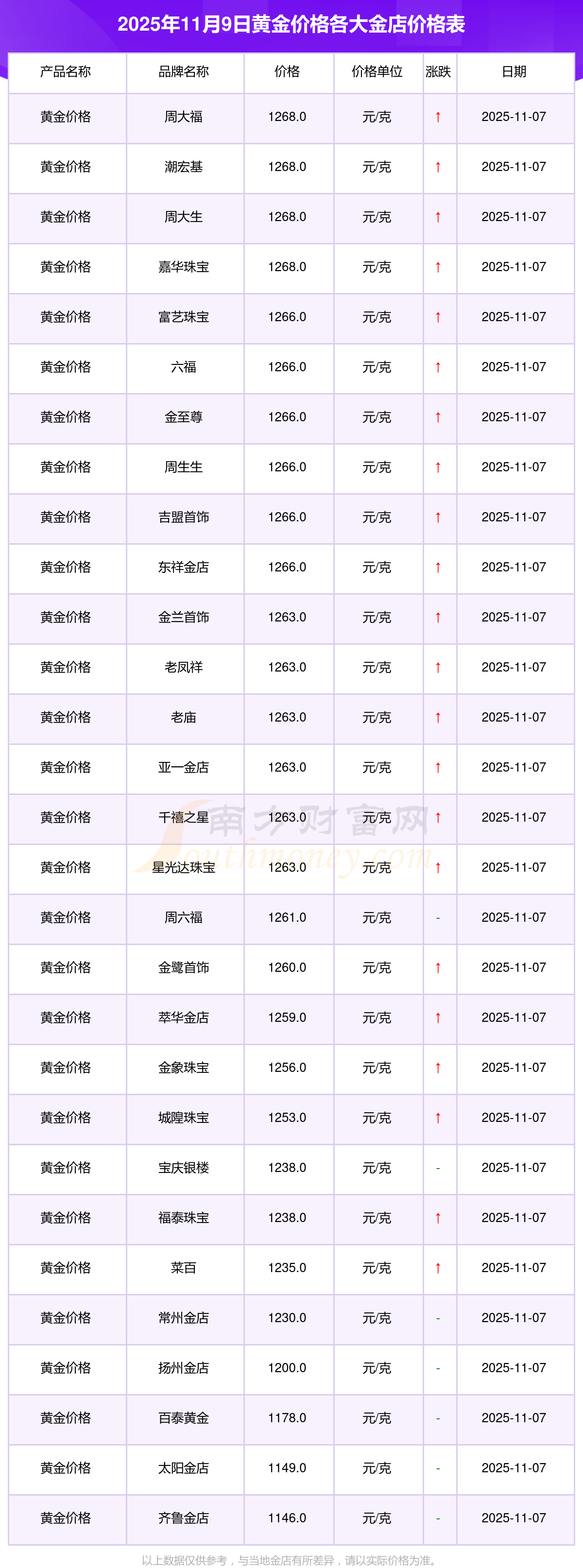 2025年11月9日,寶泉錢幣、金蘭首飾、金蘭首飾、謝瑞麟、謝瑞麟、謝瑞麟、謝瑞麟、謝瑞麟、金銀街、金銀街、金銀街等各大金店品牌黃金價格今日價格如下:寶泉錢幣11.4元/克、金蘭首飾1263.0元/克、金蘭首飾560.0元/克、謝瑞麟1202.0元/克、謝瑞麟1268.0元/克、謝瑞麟44260.0、謝瑞麟13080.0、謝瑞麟39960.0、金銀街1243.0元/克、金銀街1258.0元/克、金銀街1248.0元/克。