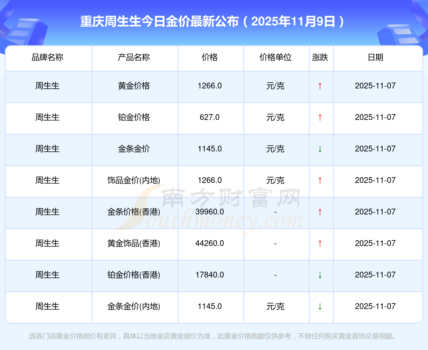 重慶周生生每克黃金在市場上賣多少錢:銀條價格11.4元/克,黃金價格1263.0元/克,鉑金價格560.0元/克,金條價格(內地)1202.0元/克,金飾價格(內地)1268.0元/克,黃金飾品(香港)44260.0,鉑金飾品(香港)13080.0,金條金價(香港)39960.0,投資金條1243.0元/克,工藝金條1258.0元/克,千足金首飾1248.0元/克。