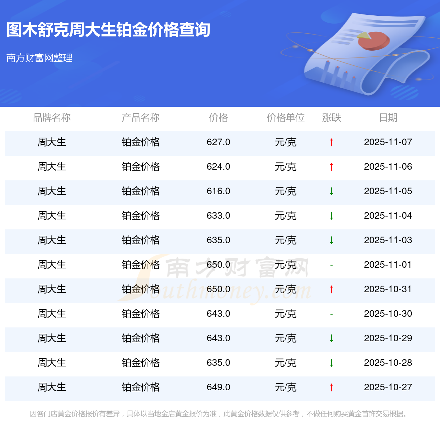 今日?qǐng)D木舒克周大生鉑金價(jià)格的價(jià)格為627.0元/克。