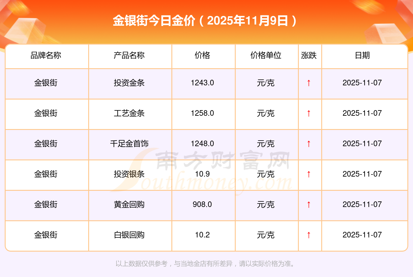 2025年11月9日金銀街最新價(jià)格:銀條價(jià)格11.4元/克,黃金價(jià)格1263.0元/克,鉑金價(jià)格560.0元/克,金條價(jià)格(內(nèi)地)1202.0元/克,金飾價(jià)格(內(nèi)地)1268.0元/克,黃金飾品(香港)44260.0,鉑金飾品(香港)13080.0,金條金價(jià)(香港)39960.0,投資金條1243.0元/克,工藝金條1258.0元/克,千足金首飾1248.0元/克。