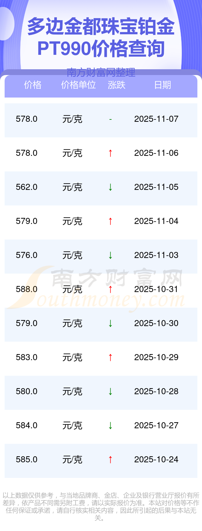 多邊金都珠寶 鉑金PT990今日最新的價(jià)位是578.0元/克。