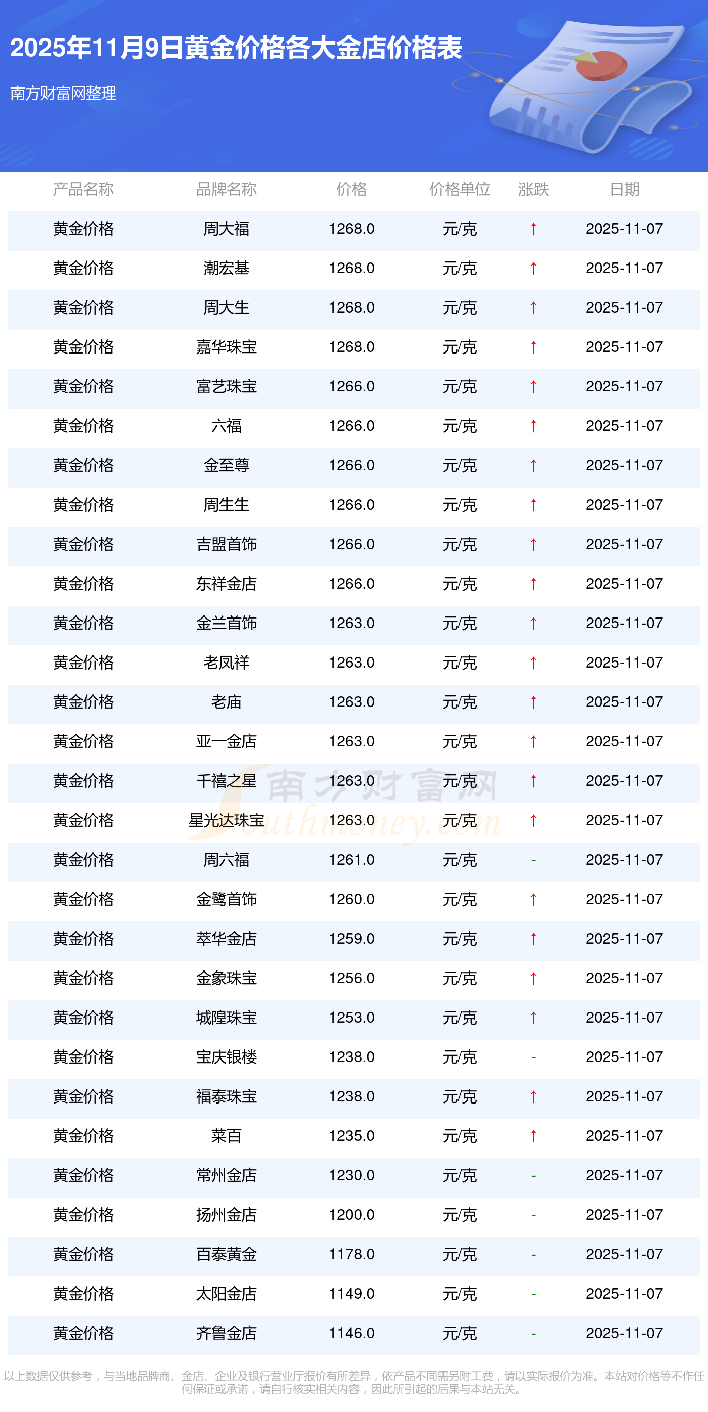 2025年11月9日寶泉錢(qián)幣、金蘭首飾、金蘭首飾、謝瑞麟、謝瑞麟、謝瑞麟、謝瑞麟、謝瑞麟、金銀街、金銀街、金銀街等各大金店品牌黃金價(jià)格最新價(jià)格如下:寶泉錢(qián)幣銀條價(jià)格11.4元/克,金蘭首飾黃金價(jià)格1263.0元/克,金蘭首飾鉑金價(jià)格560.0元/克,謝瑞麟金條價(jià)格(內(nèi)地)1202.0元/克,謝瑞麟金飾價(jià)格(內(nèi)地)1268.0元/克,謝瑞麟黃金飾品(香港)44260.0,謝瑞麟鉑金飾品(香港)13080.0,謝瑞麟金條金價(jià)(香港)39960.0,金銀街投資金條1243.0元/克,金銀街工藝金條1258.0元/克,金銀街千足金首飾1248.0元/克。