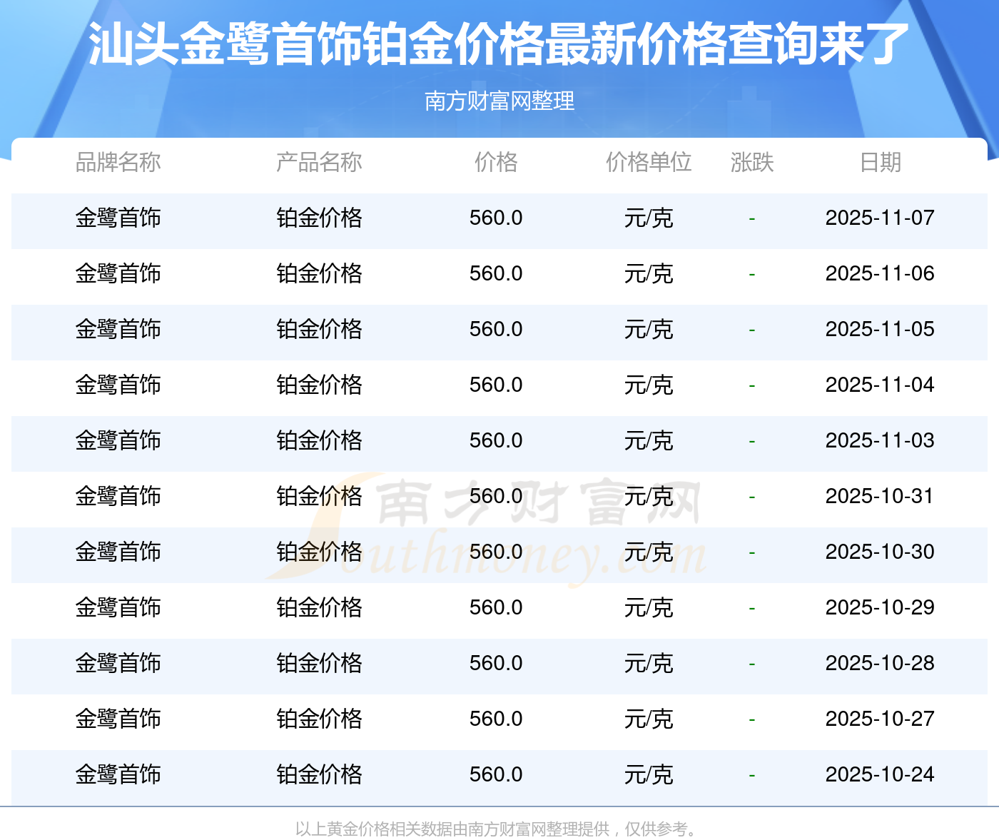 560.0元/克,此乃汕頭金鷺首飾于 2025年11月9日鉑金價格的掛牌價格。