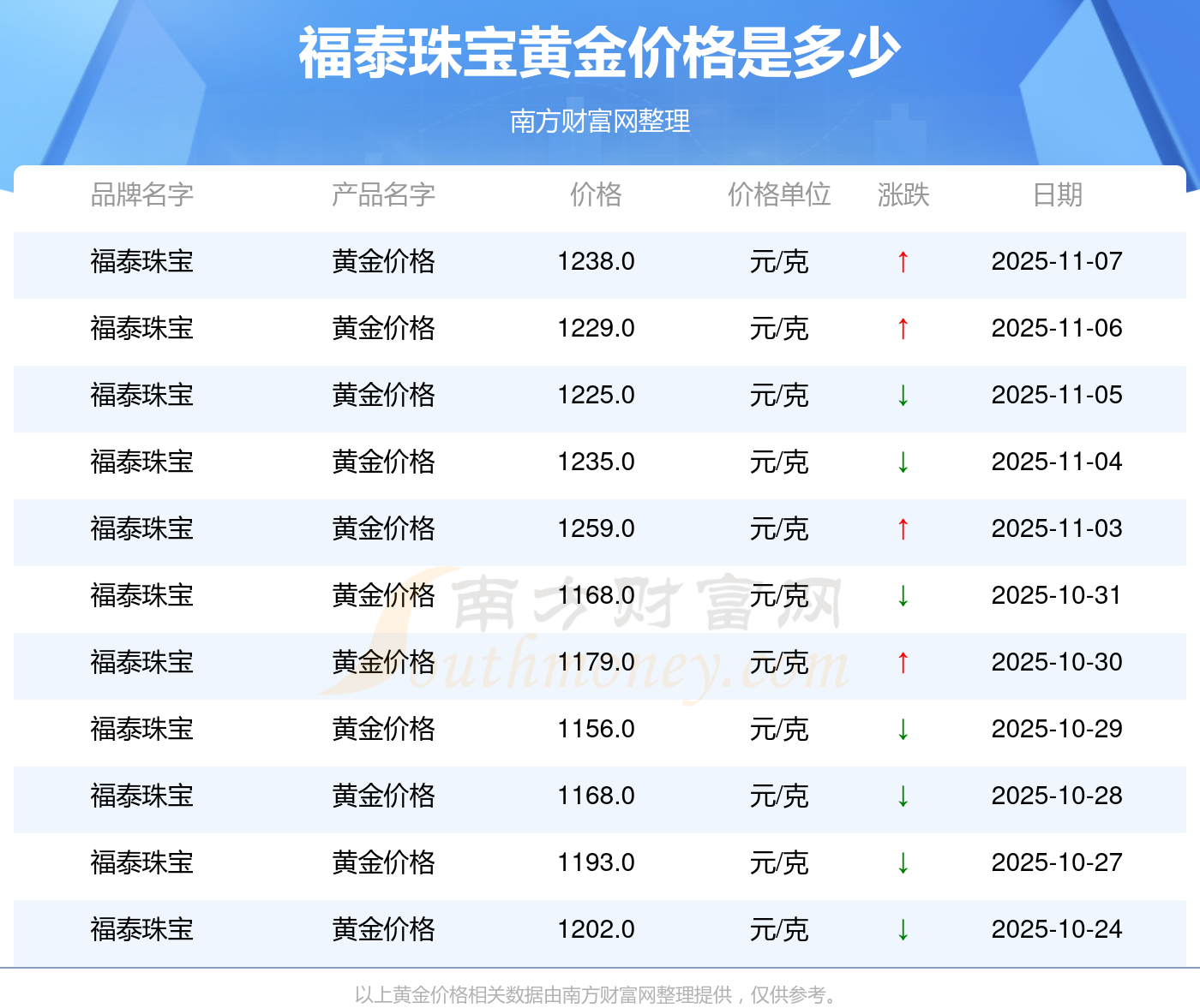 想知道今日黃金價(jià)格,目前黃金一克的價(jià)錢(qián)是多少呀?黃金價(jià)格一般是多少錢(qián)一克?1238.0元/克的價(jià)格,是福泰珠寶今日 黃金價(jià)格的最新行情。