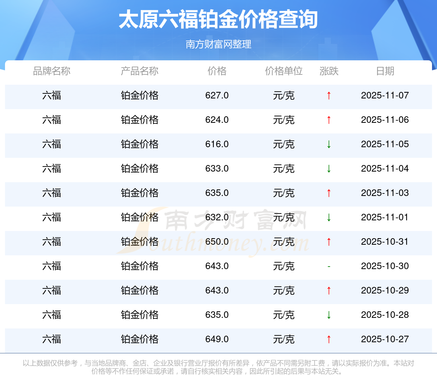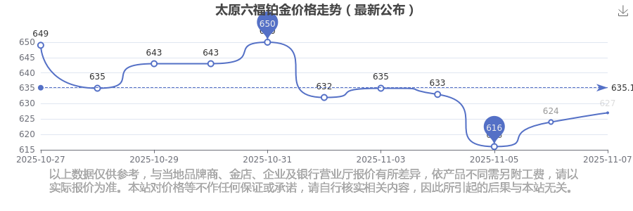 2025年11月9日太原六福鉑金價(jià)格:627.0元/克。