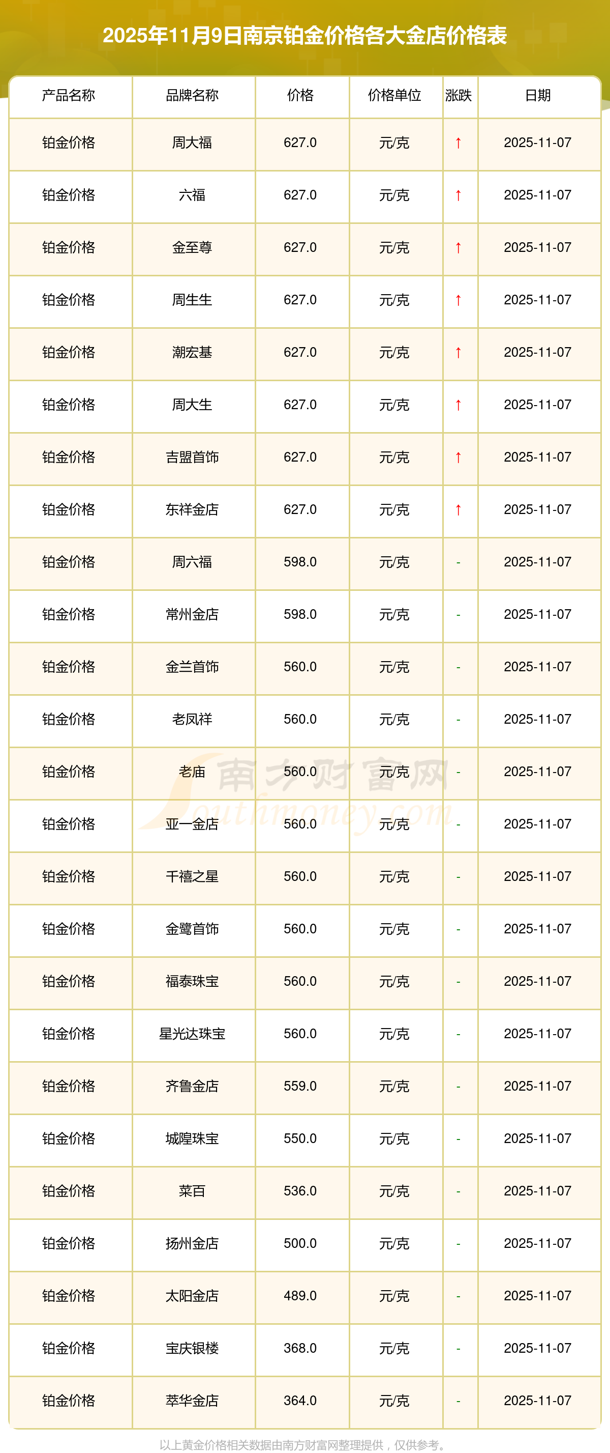 據(jù)了解,今日南京鉑金價格最低的金店是萃華金店,報價364.0元/克,最高的是周大福,報價627.0元/克。今日鉑金價格高低差為263元/克。