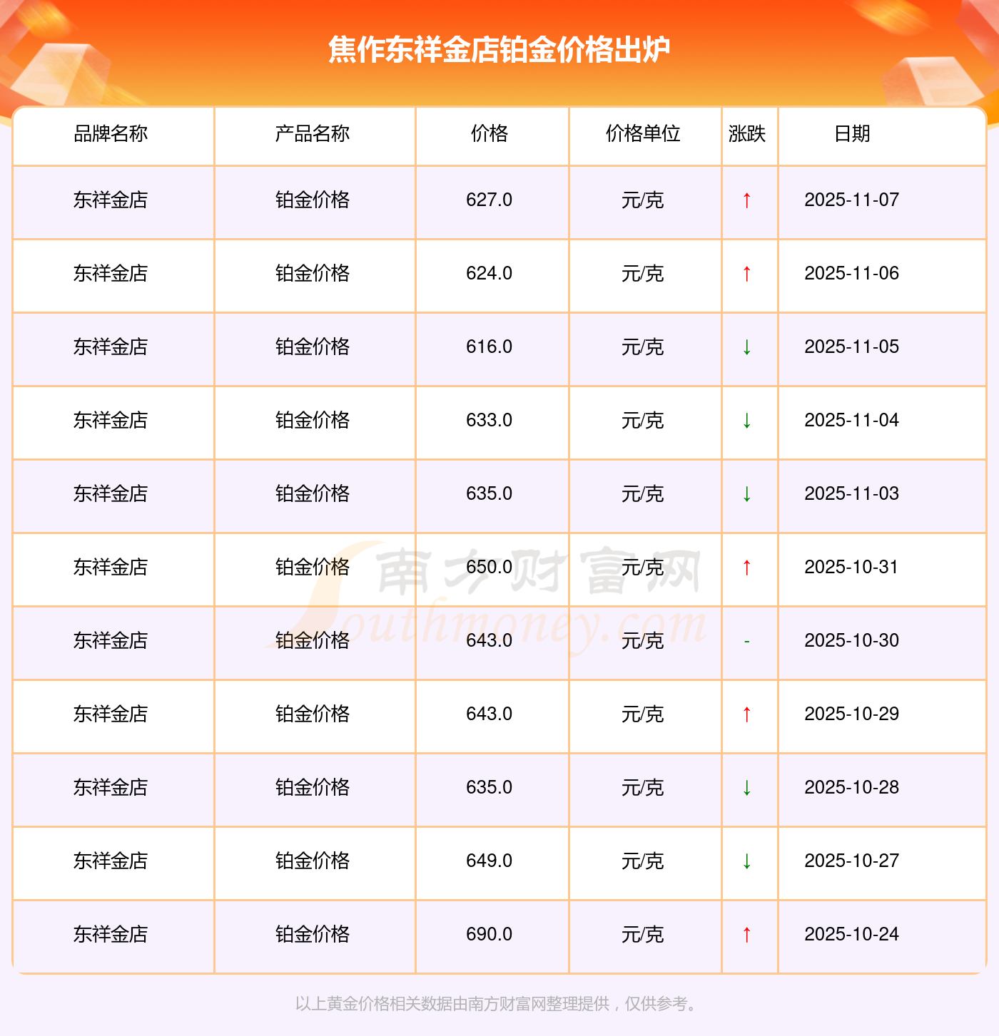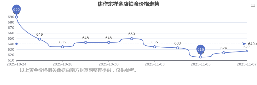 今日焦作東祥金店鉑金價格:627.0元/克。